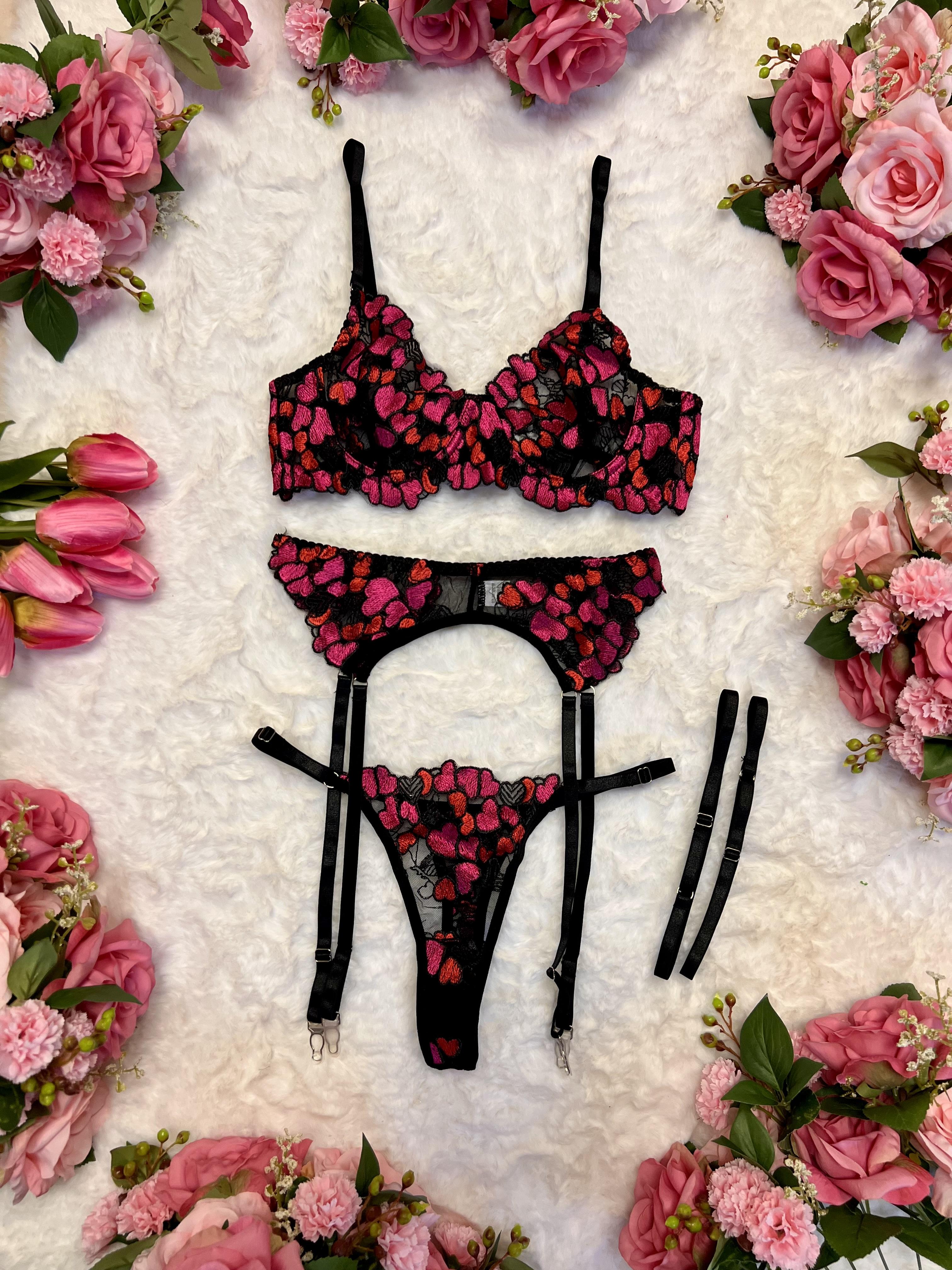 Cariad - Black and Red Heart Embroidered 4 Piece Lingerie Set