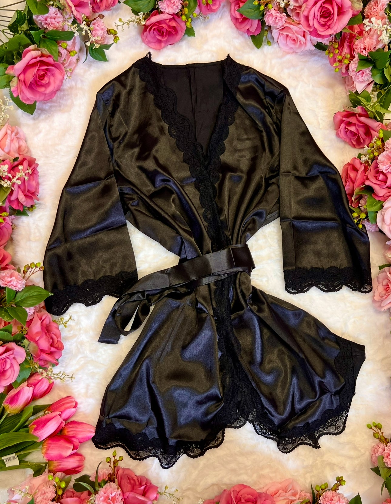 Dark Secret Dressing Gown - Black Satin Lace Robe with Scalloped Lace Trim, Long Sleeves & Tie Waist – Elegant Lingerie Cover-Up