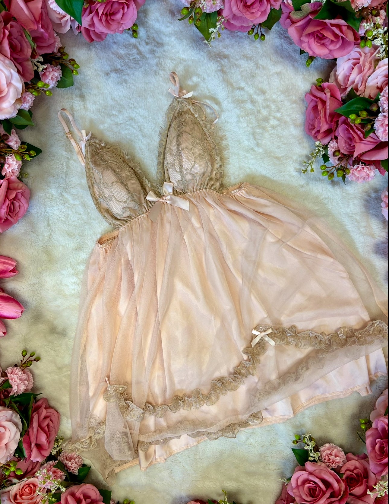 Dusk Blush -Champagne Satin Babydoll Lingerie Dress with Lace Cups and Bow Details
