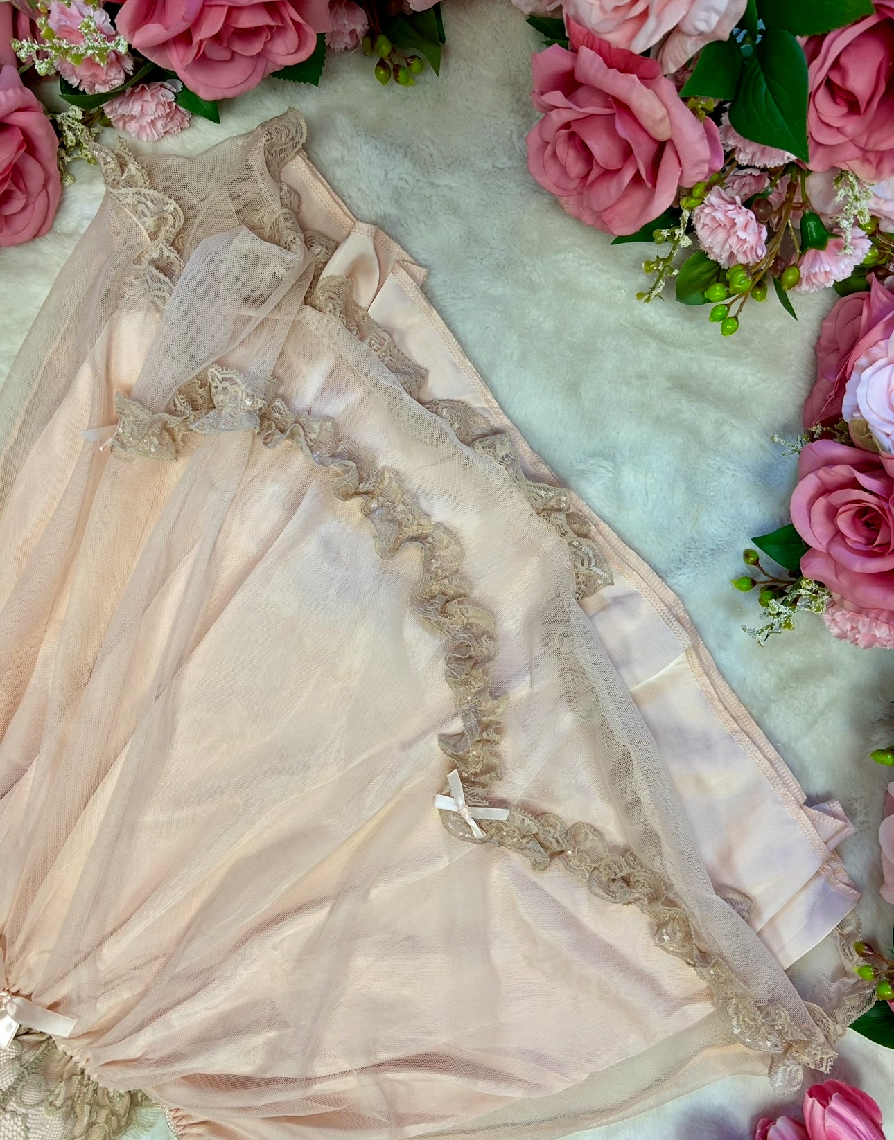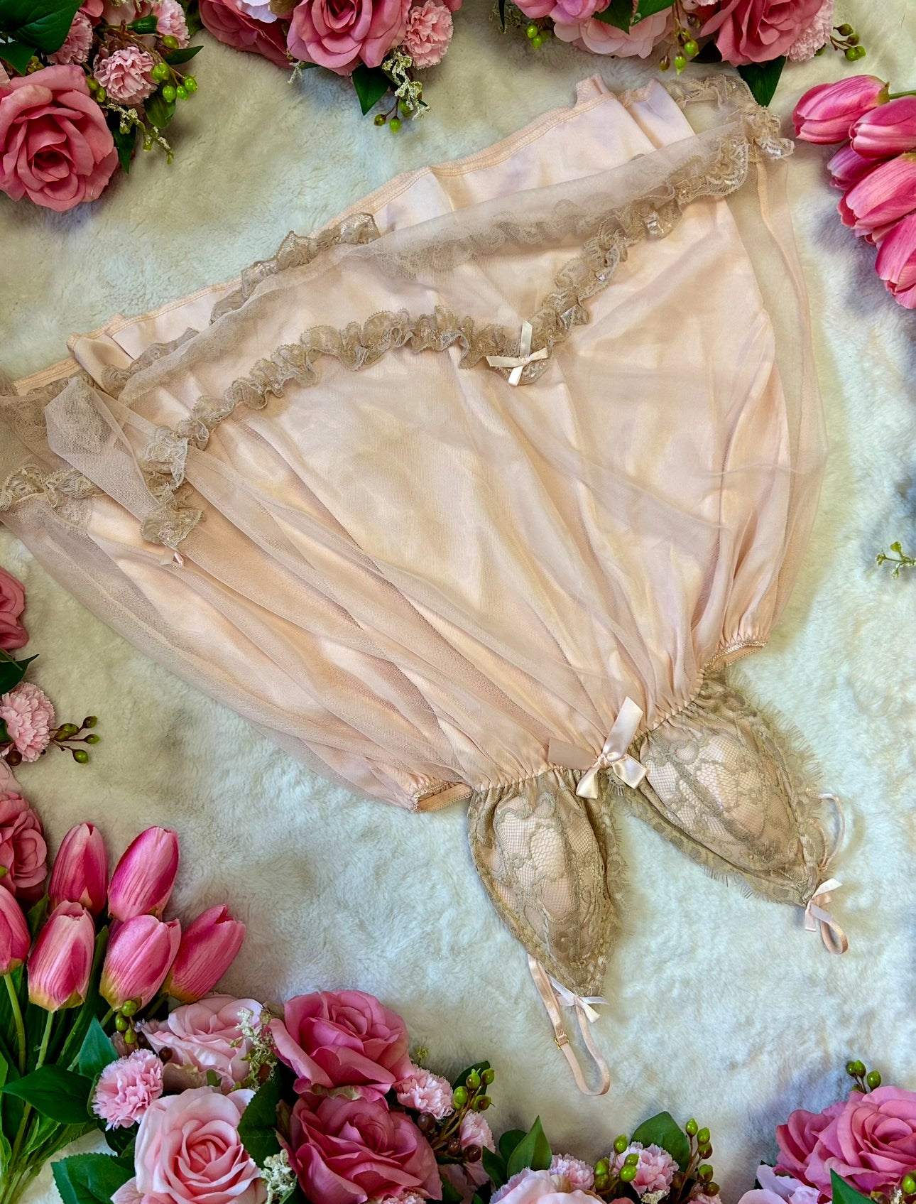 Dusk Blush features a Champagne Satin Babydoll Lingerie Dress. It's adorned with lace cups and bow details, adding a touch of sophistication. The dress combines comfort with style, perfect for special occasions. Its design ensures a flattering fit, enhancing your silhouette effortlessly.