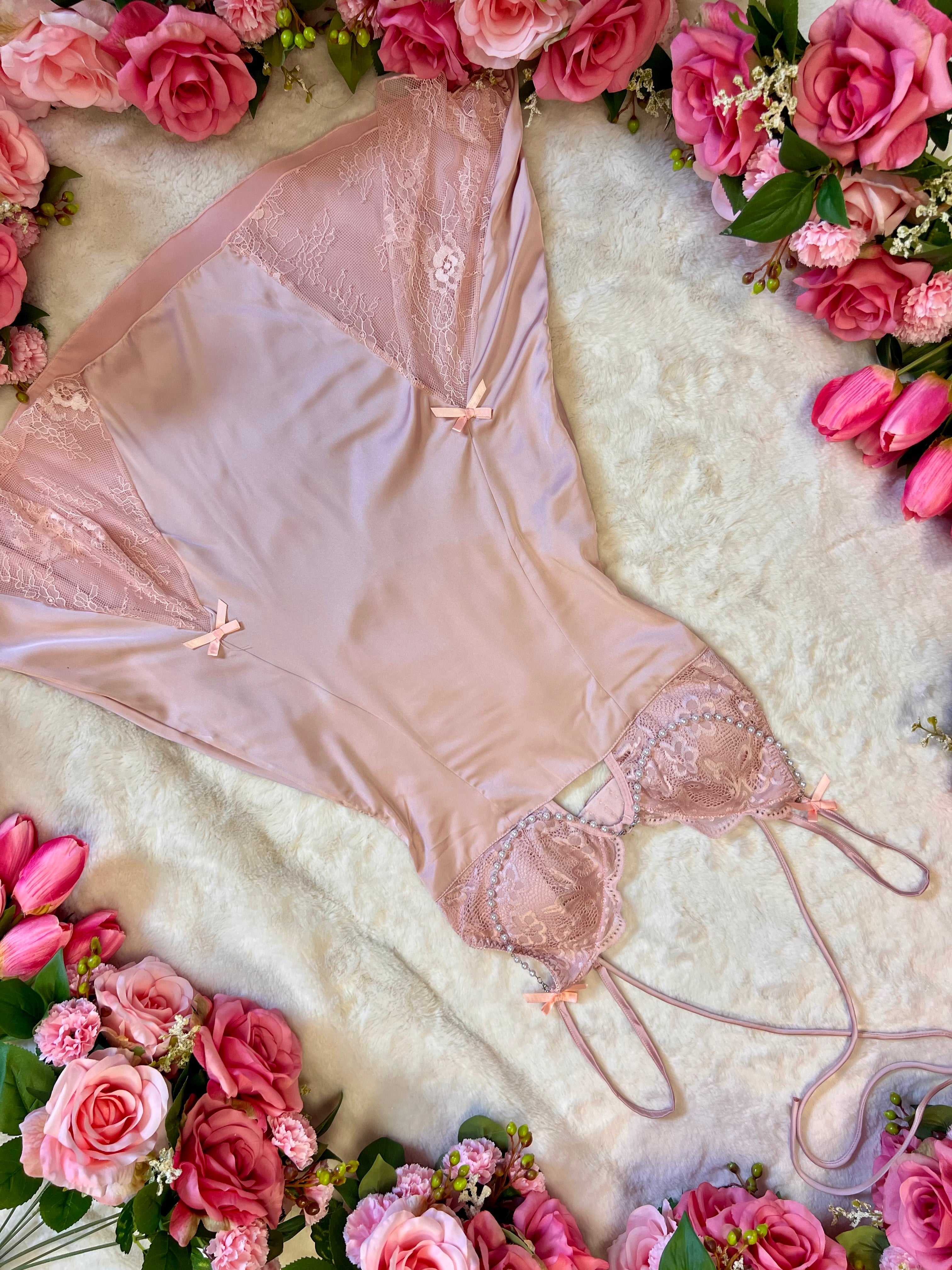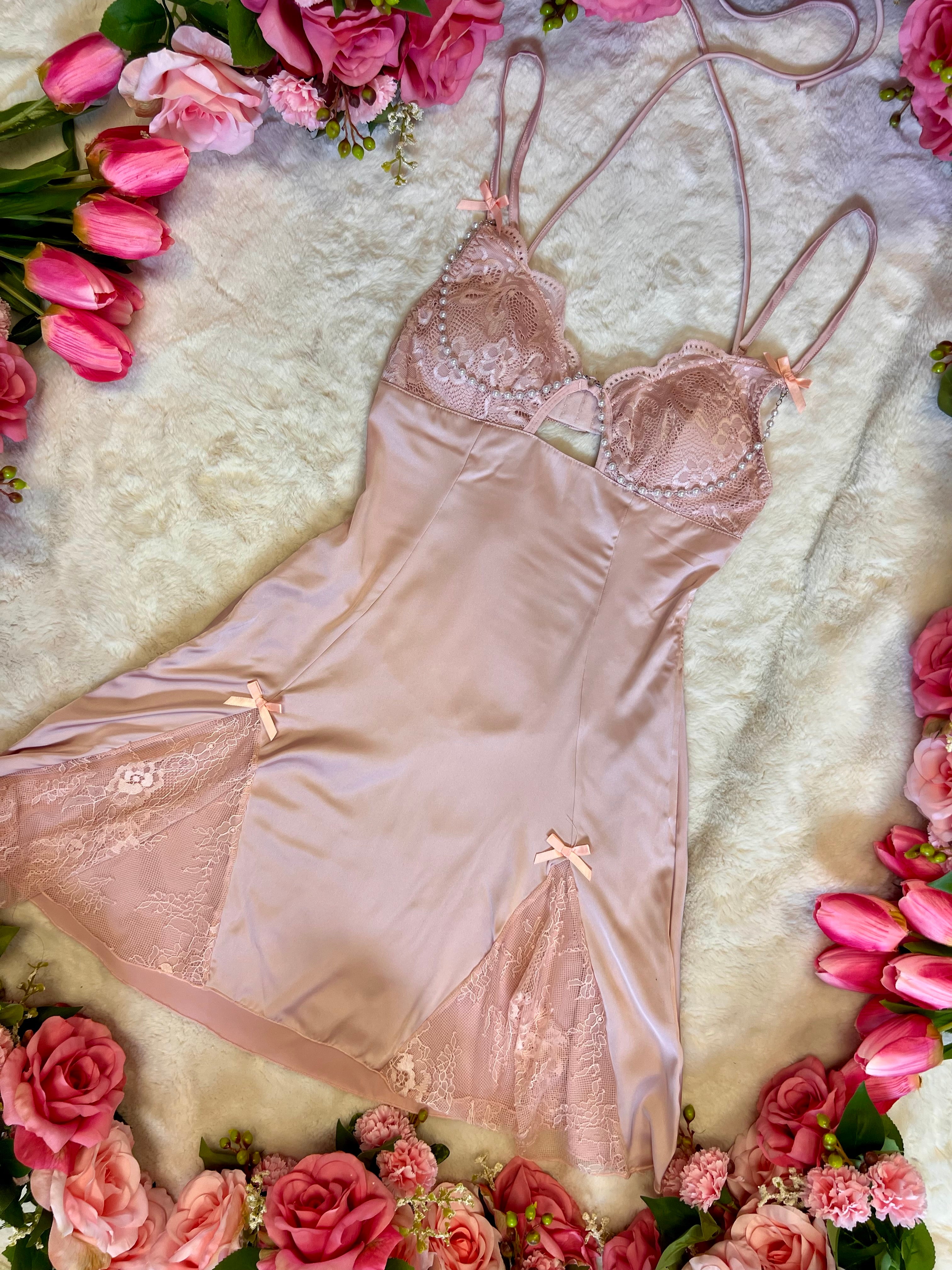 Dutchess Petal - Blush Pink Satin Babydoll Lingerie Dress with Lace Cups Detachable Pearl Detailing, Cut-Out Detail & Bow Accents
