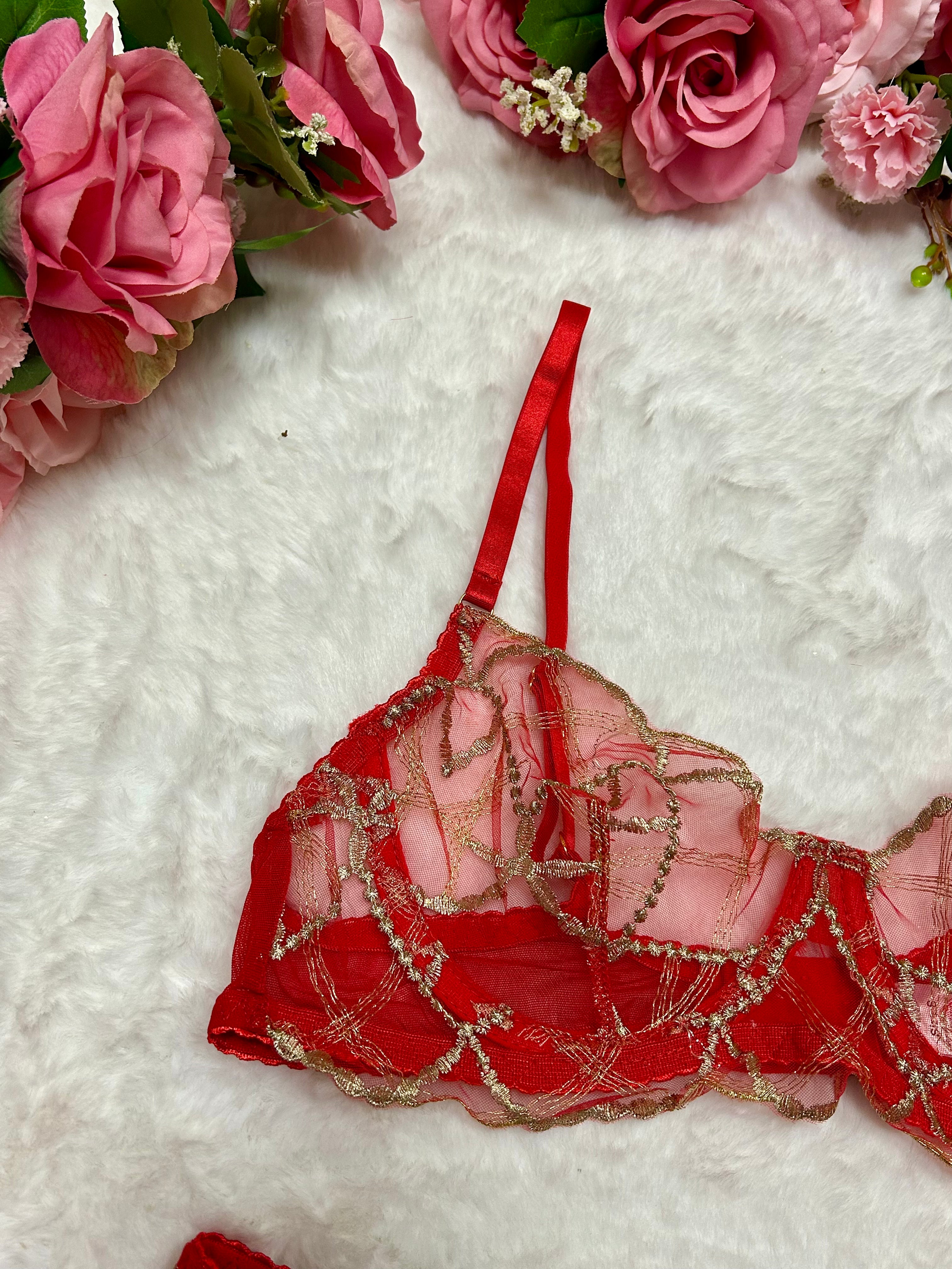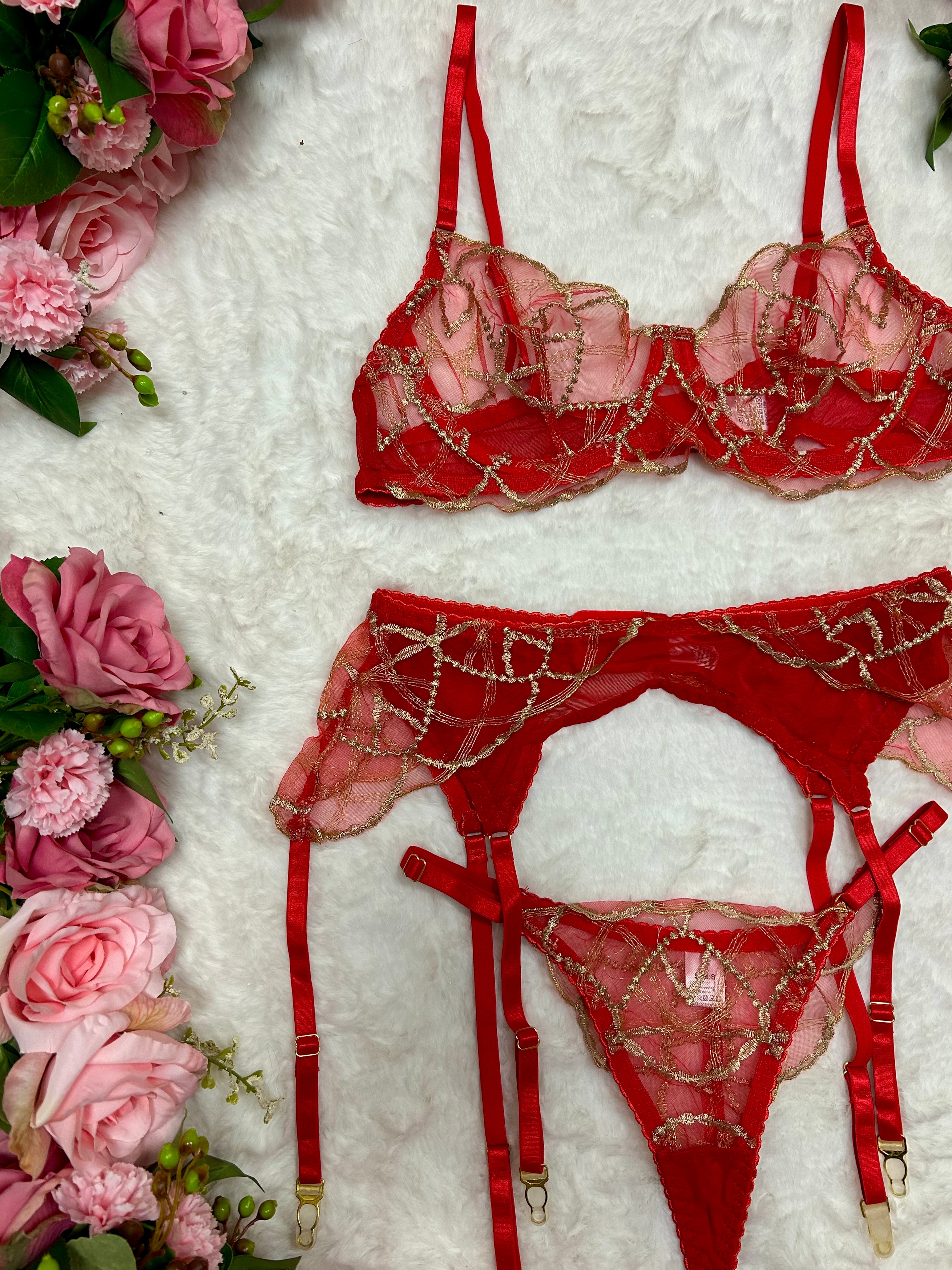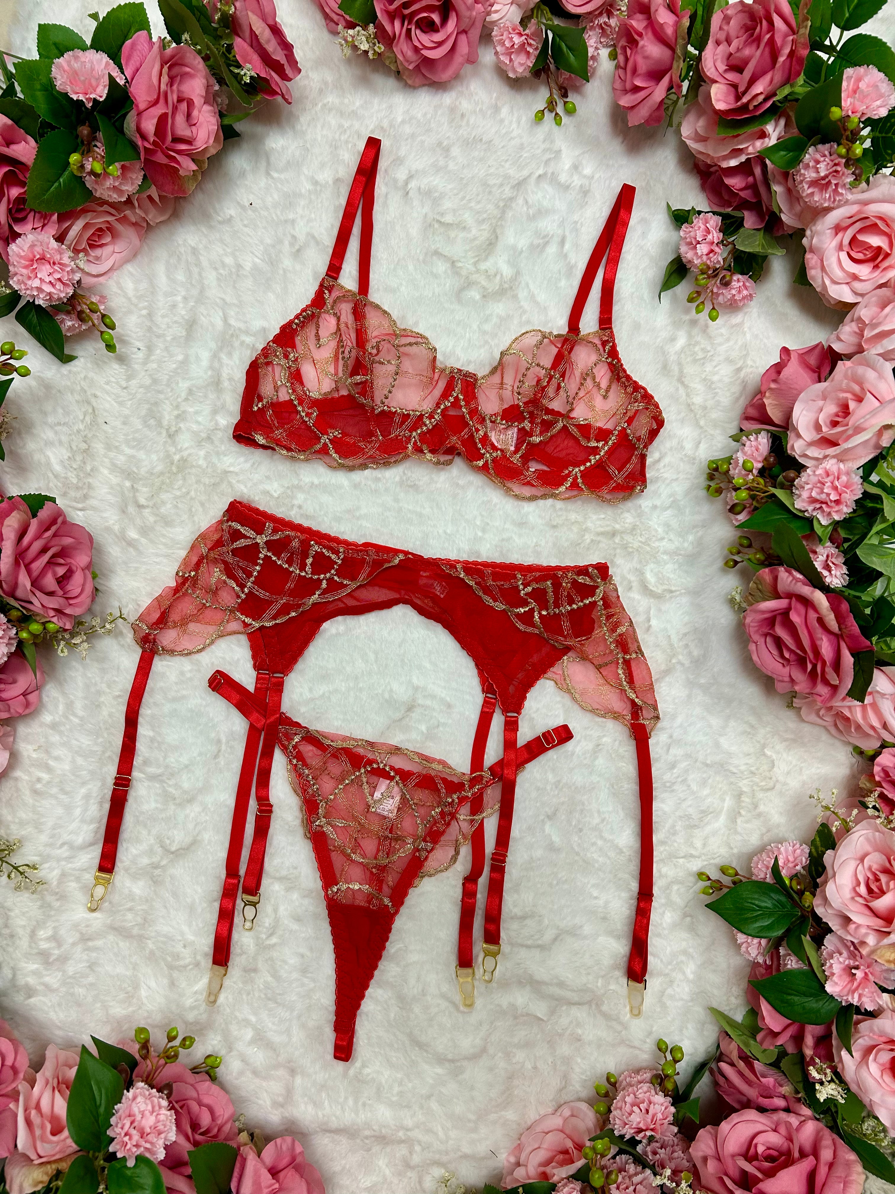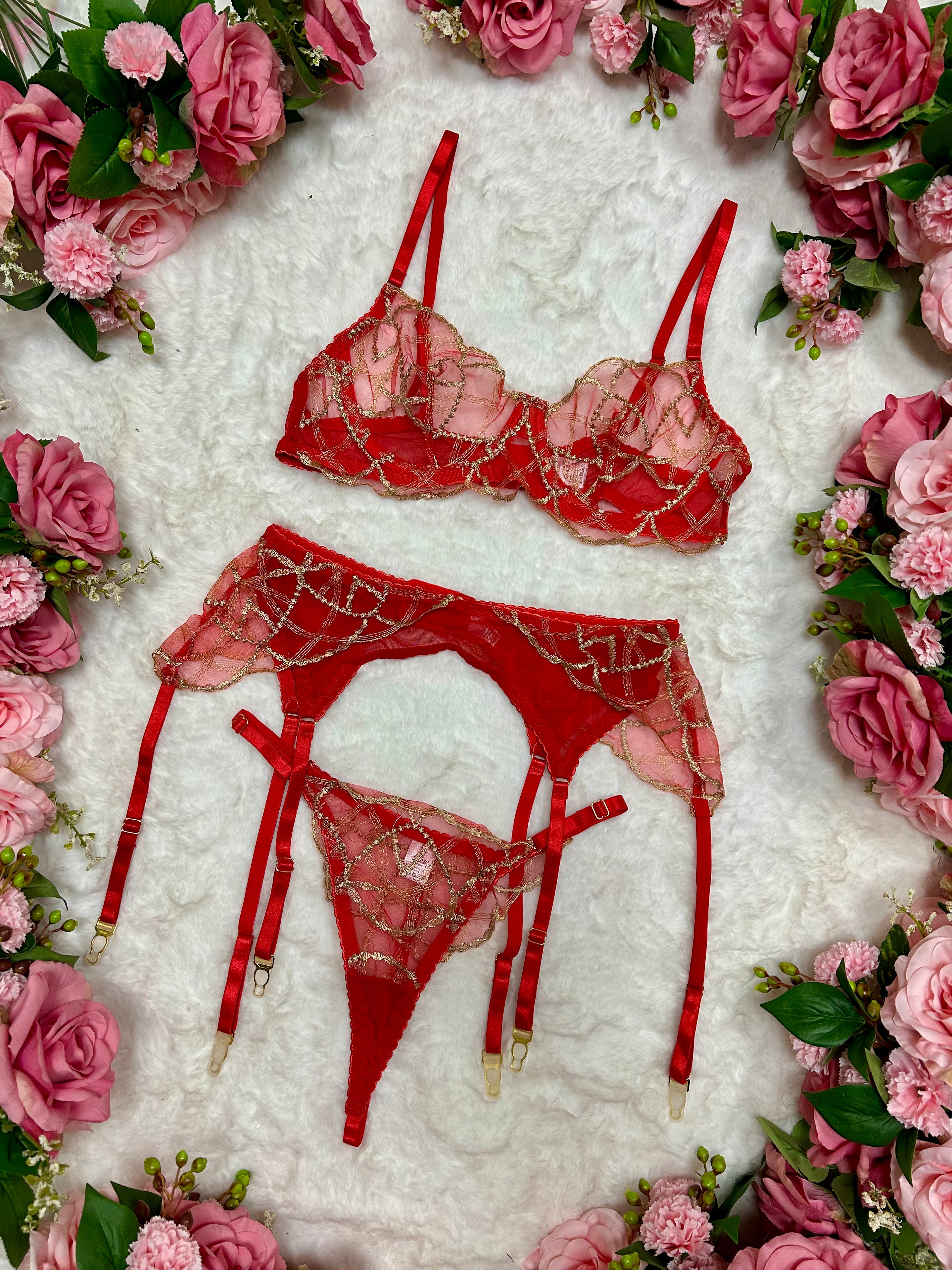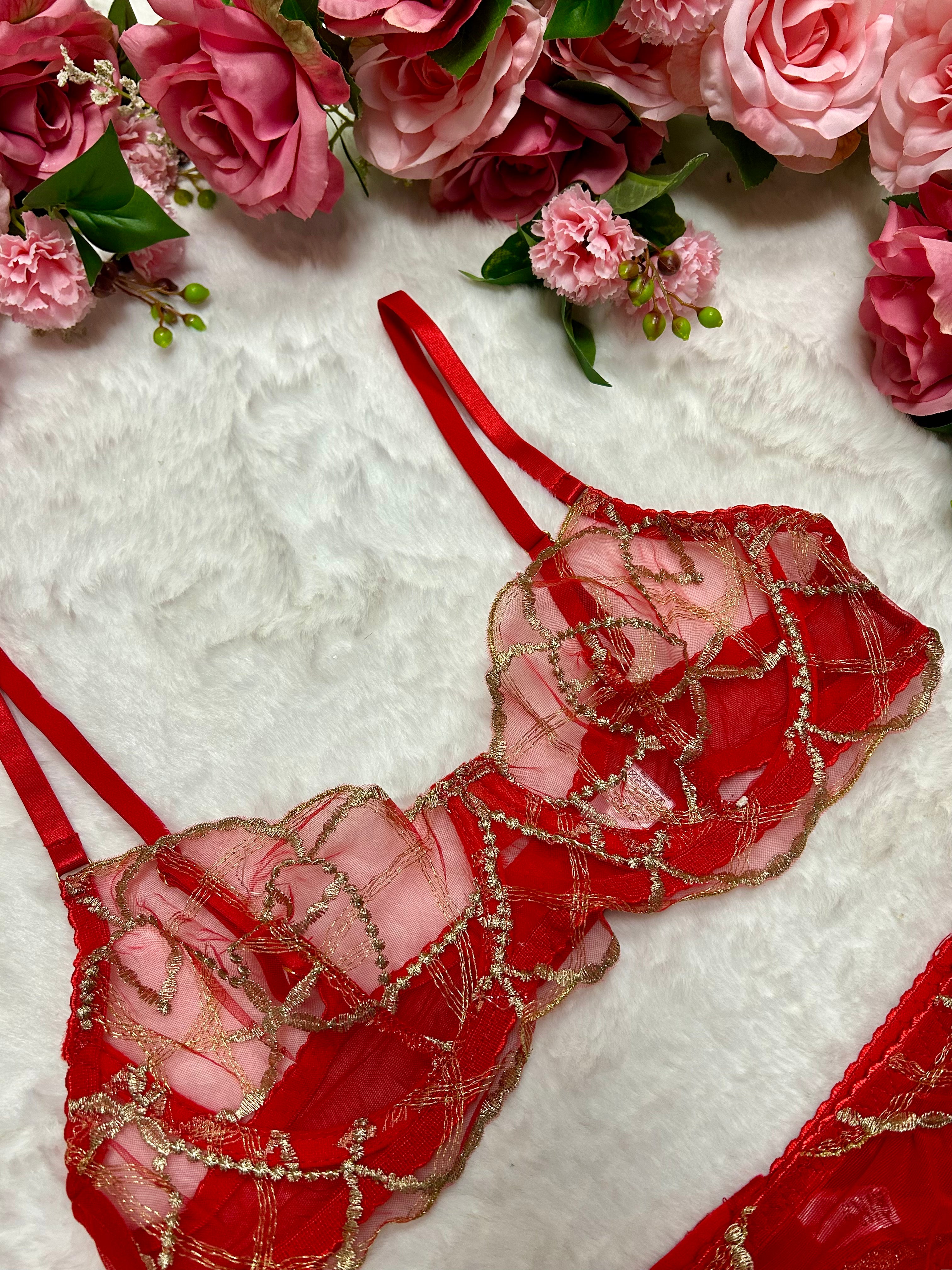 Step into the New Year glowing in red. Our Midnight Muse Red & Gold Lingerie Set is made for the girls who want to sparkle all night long ✨ Featuring sheer red mesh layered with shimmering gold embroidery, this statement three-piece set is romantic, luxe and irresistibly feminine.