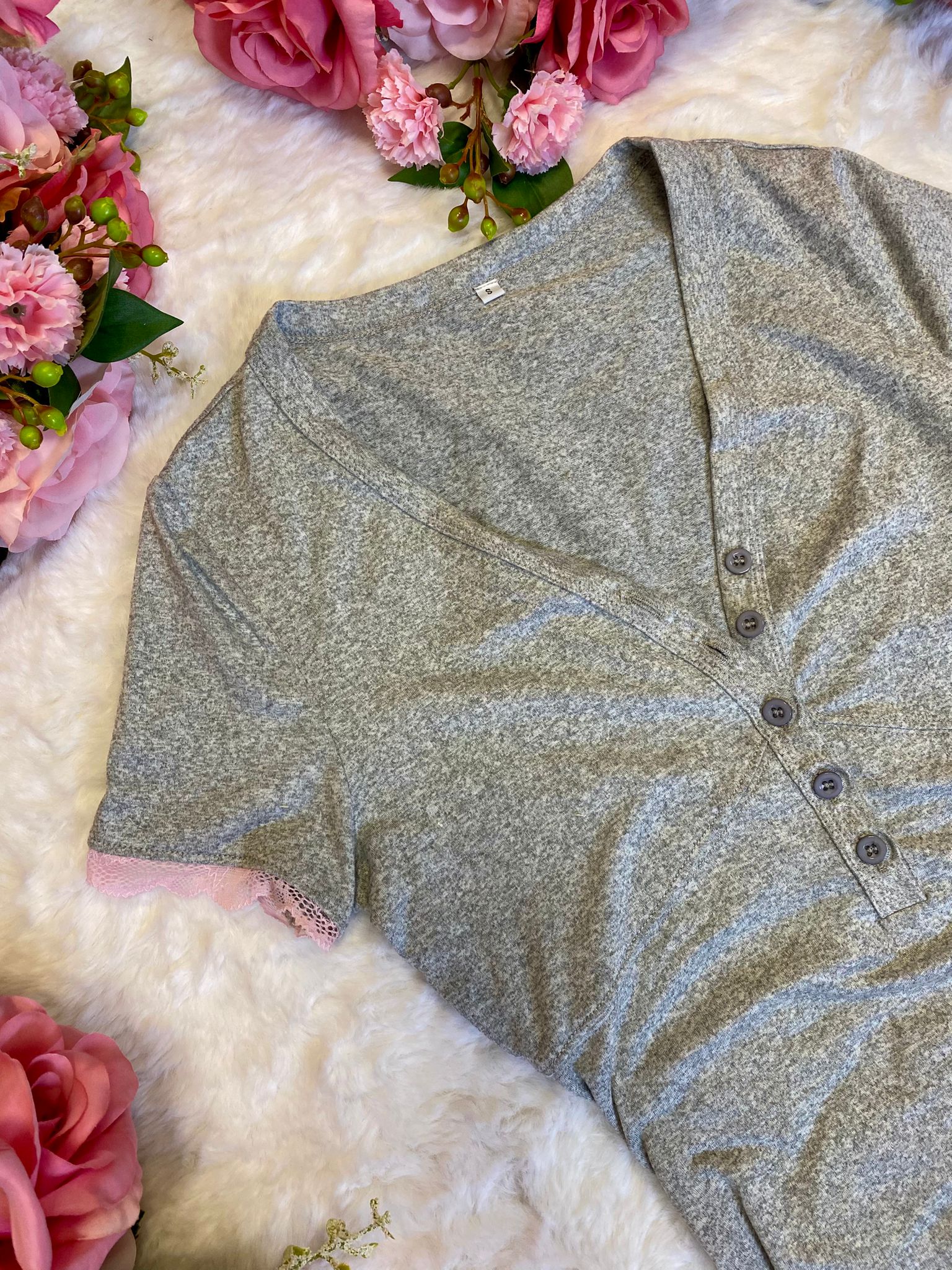 Grey Lace Trim Romper – Cute Short Sleeve Loungewear Playsuit with Pink Lace