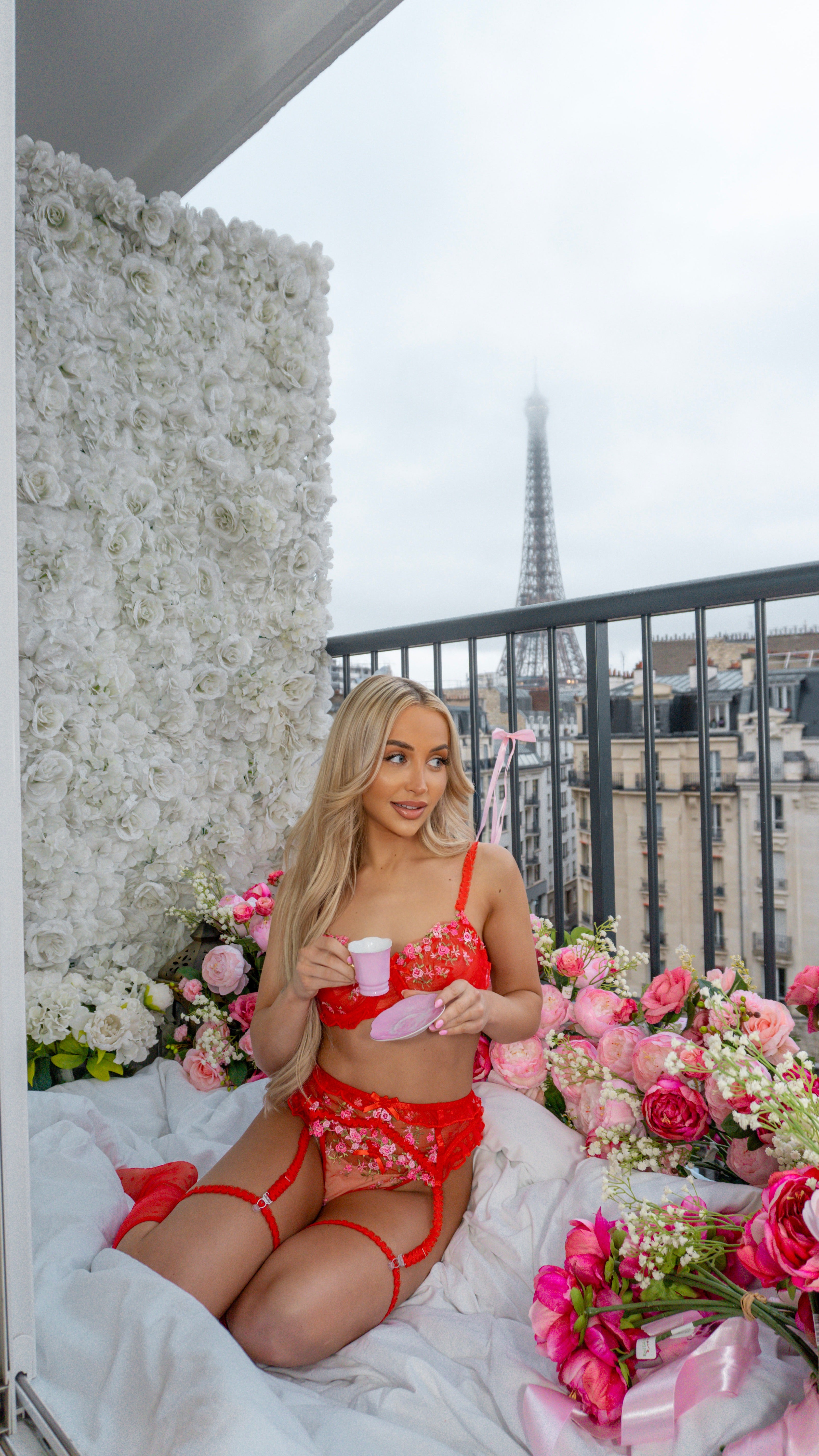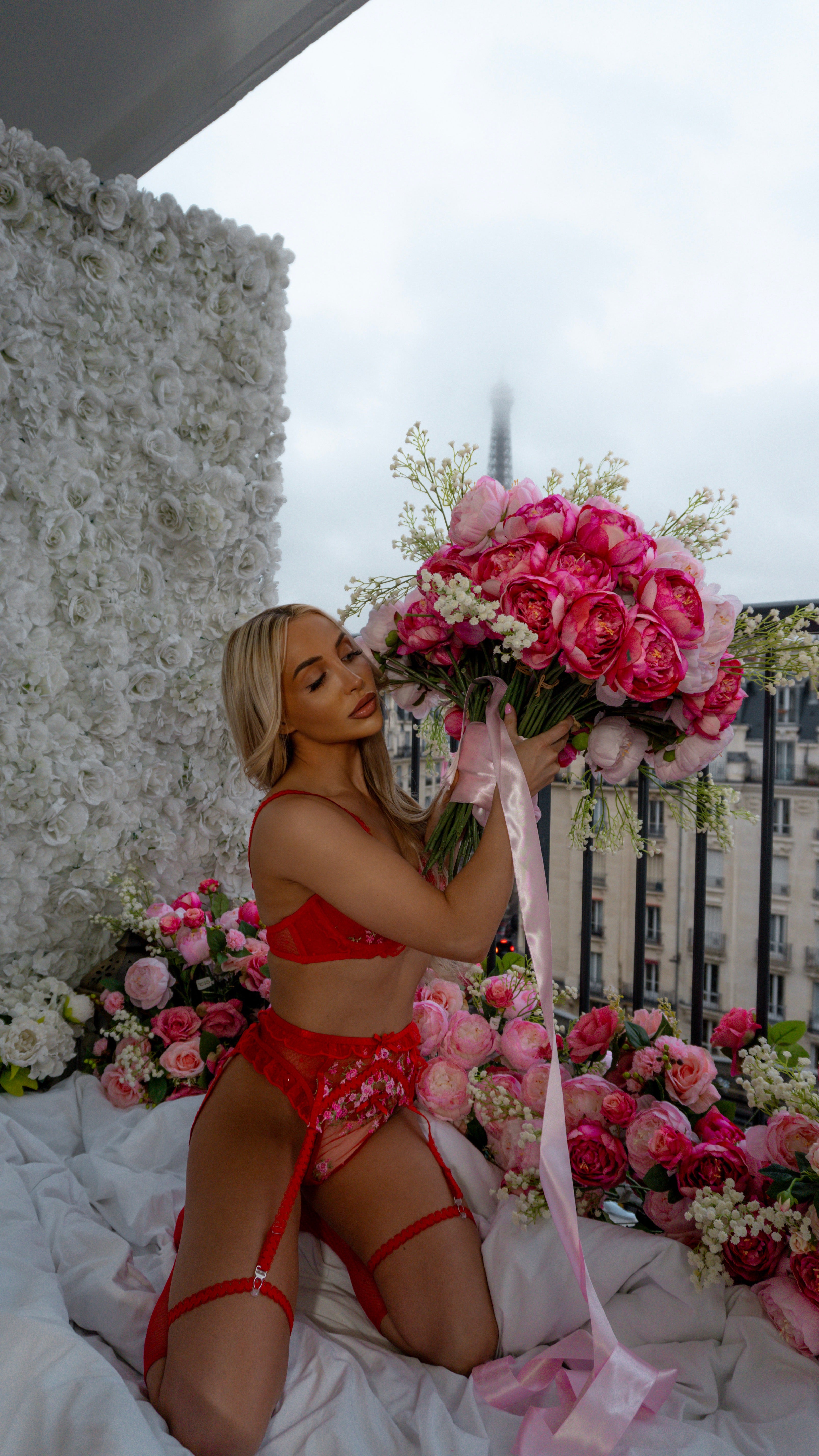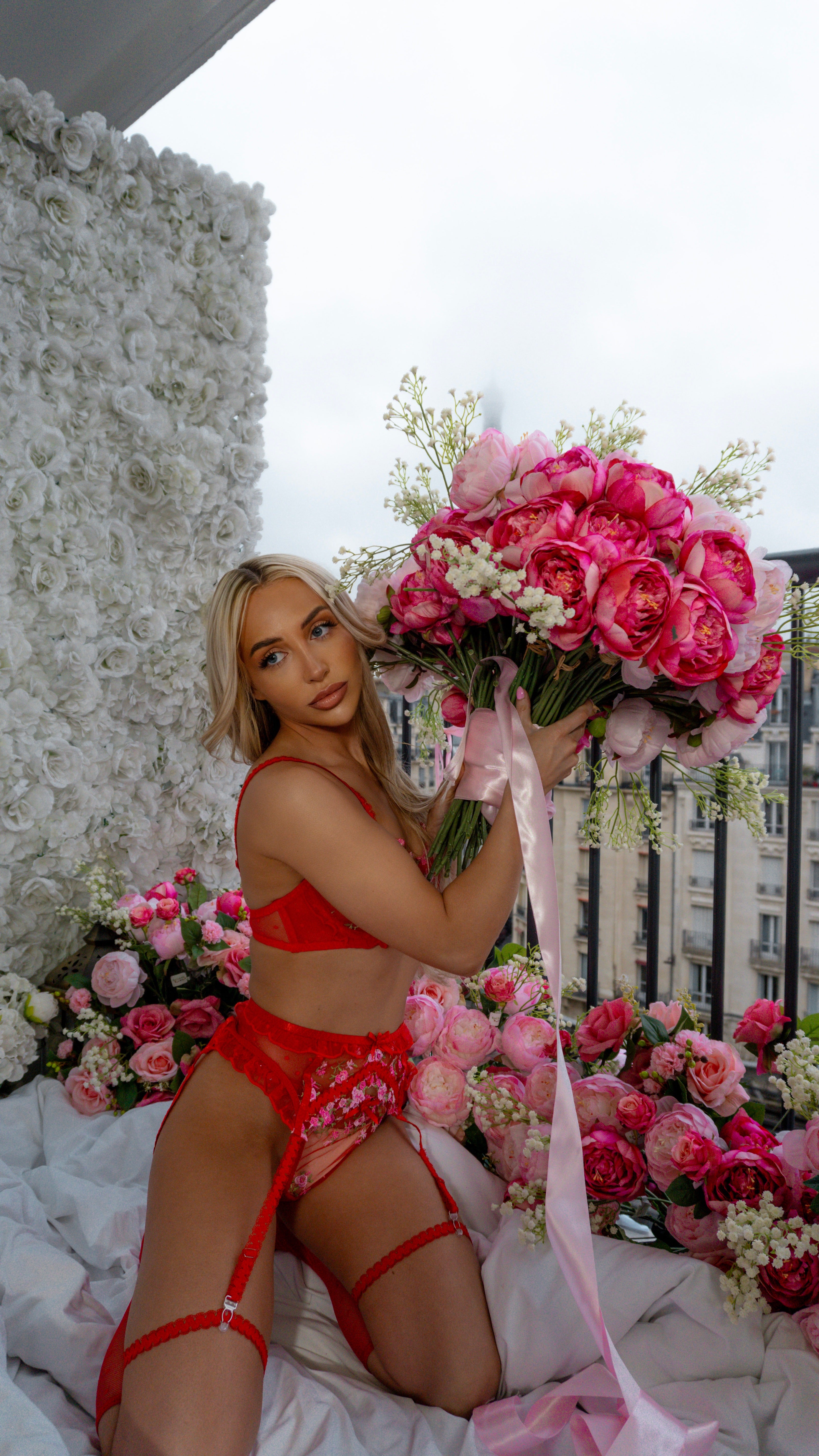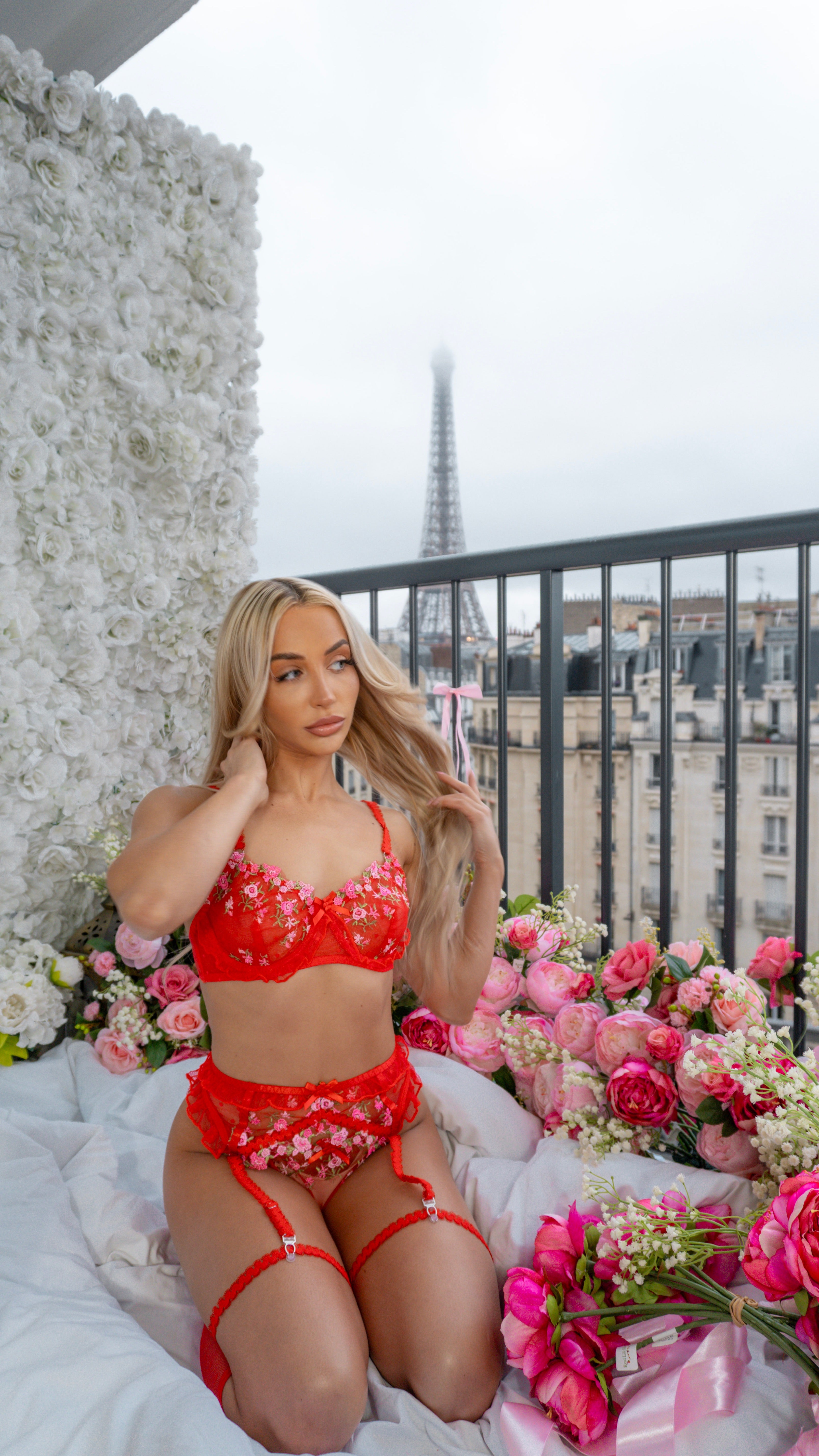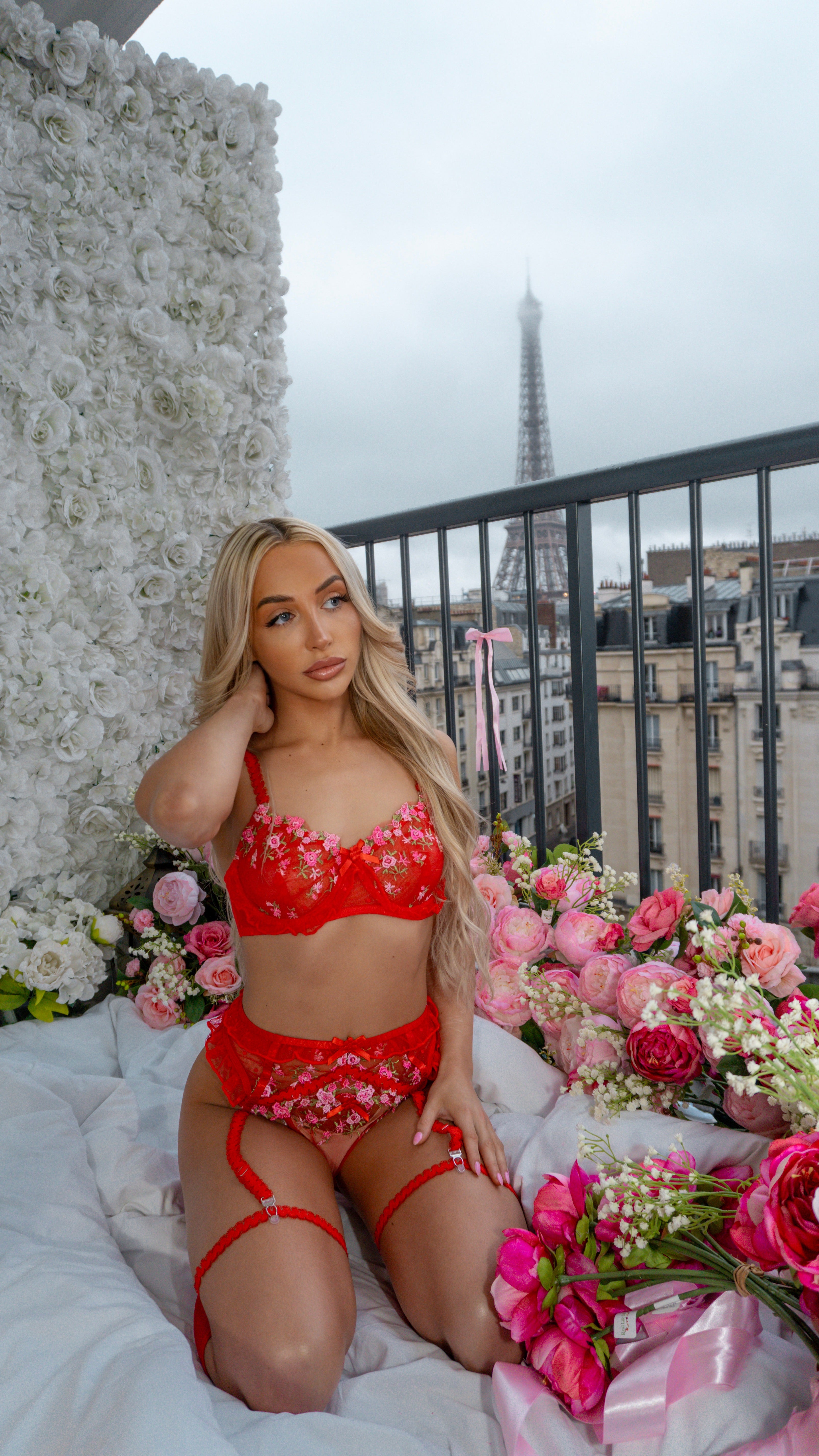 Fall in love, Parisian style. The Je T’aime three-piece set is romance in lingerie form — a fiery red mesh embroidered with delicate baby pink florals, finished with dainty scalloped edges and cheeky details. Designed to flatter and entice, this set includes a supportive underwired bra, floral mesh thong, and matching suspender belt with adjustable straps for the perfect fit.