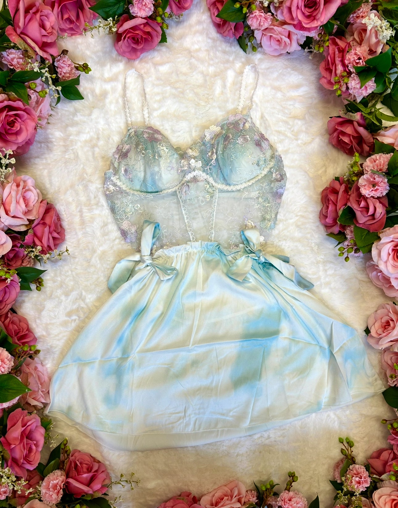 Key To Midnight Babydoll - Blue Padded Floral Lace Babydoll with Underwired Cups, Sheer Mesh Bodice & Ombre Satin Skirt – Adjustable Straps, Side Tie Bows
