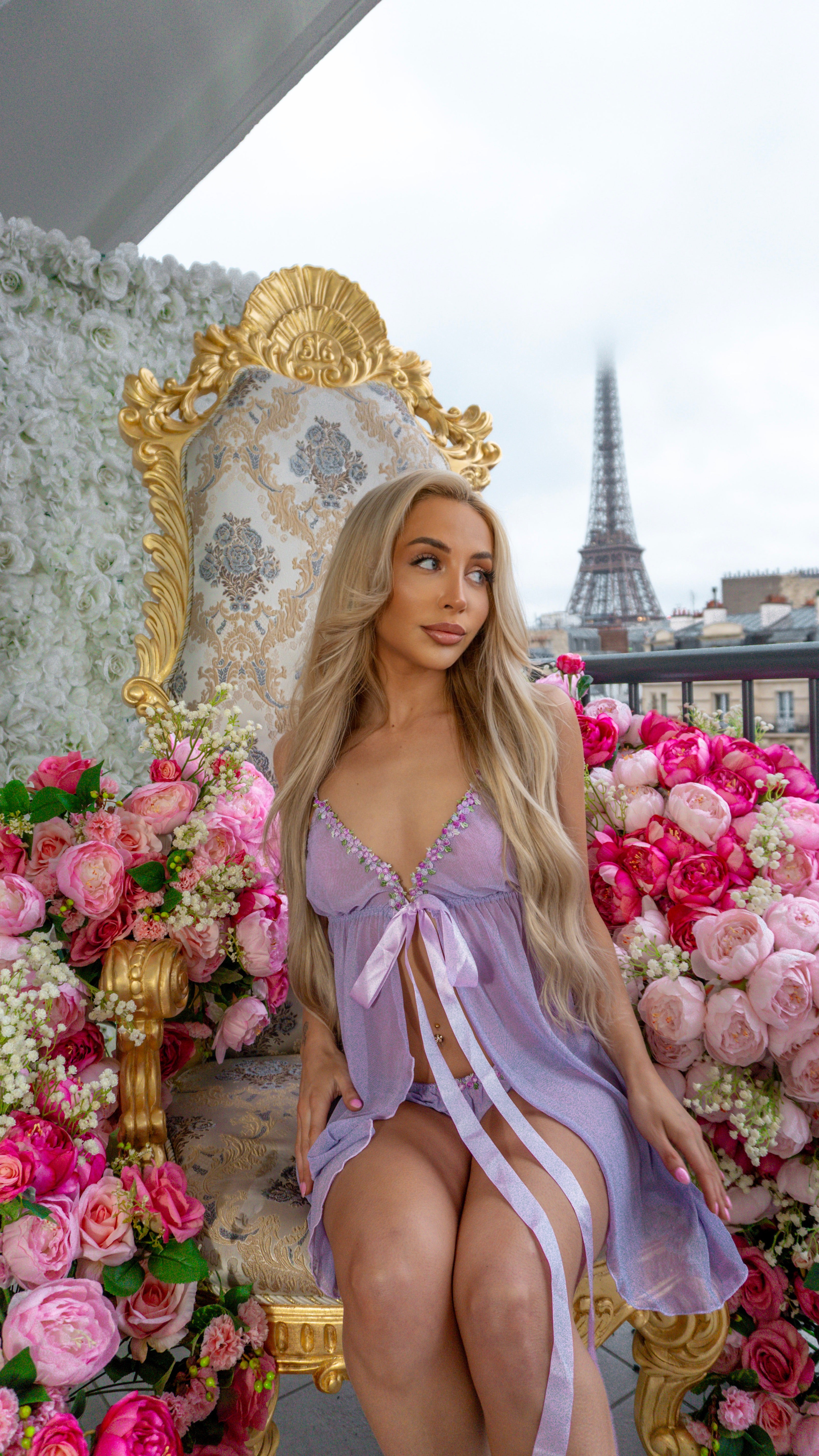 Sweet, soft, and sprinkled in fairytale magic — the Lavender Petals babydoll is your pastel dream come to life. With delicate lilac mesh, satin ribbon ties, and embroidered floral trim, this set is made for your inner princess. Comes complete with matching frilly panties for the perfect finishing touch.