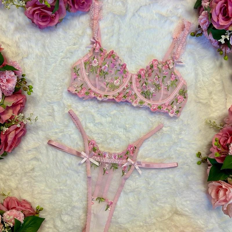 Say hello to Juliet, your new soft-girl staple. This 2 piece lingerie set pairs a pretty pink floral embroidered bra with matching pants for that effortless “I woke up cute” vibe.