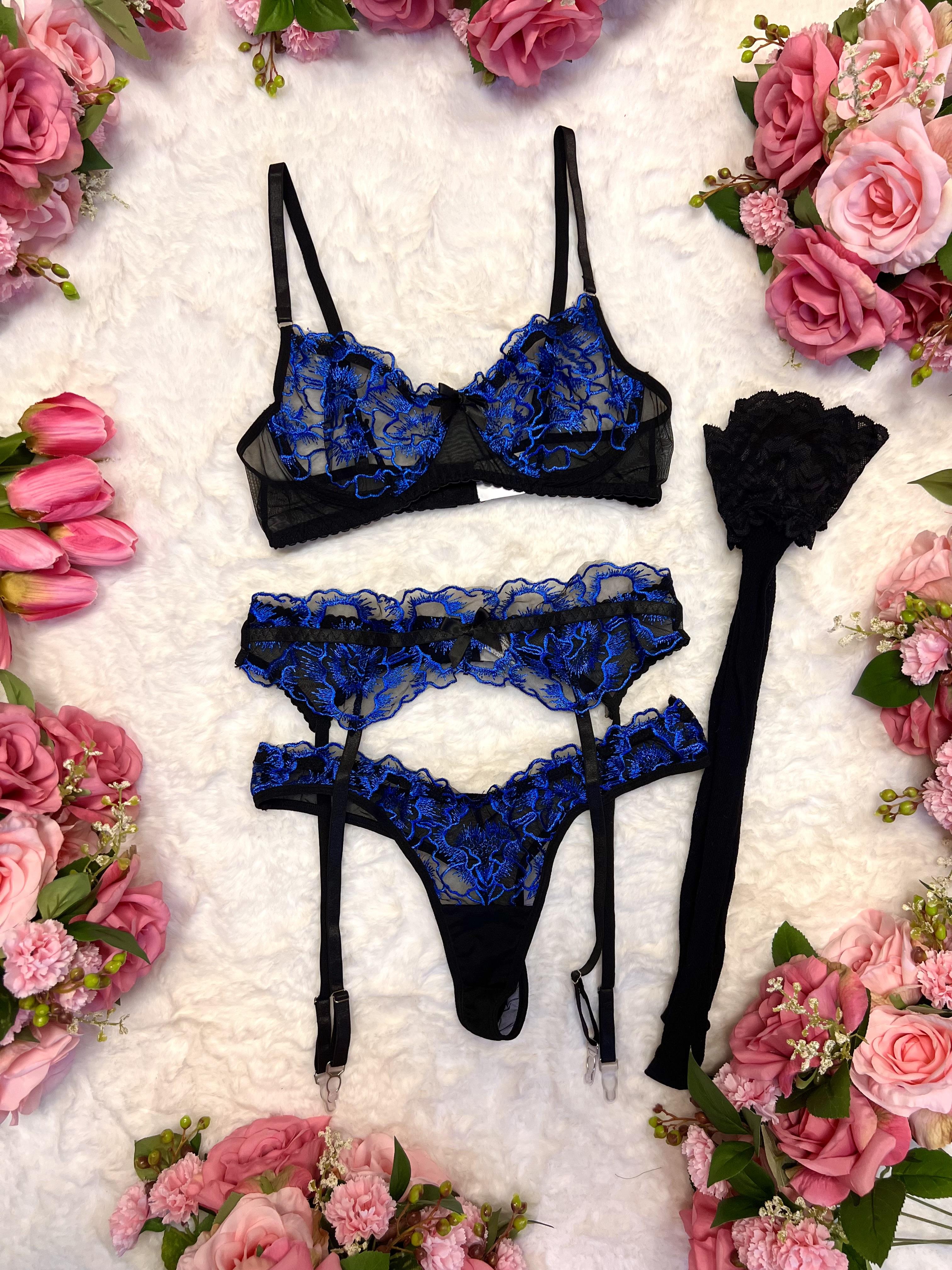 Turn the lights down and let Luciana do the talking. This black mesh and electric-blue lace 4 piece lingerie set includes a bra, garter belt, thong and matching stockings – everything you need for a sultry, put-together lingerie look in one go.