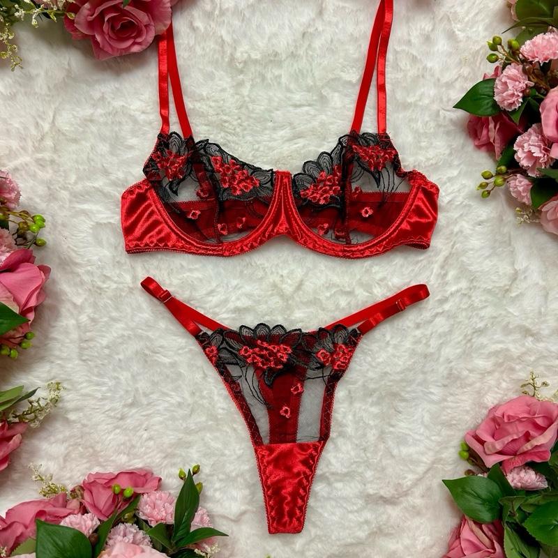 The bra features smooth satin cups framed with sheer black mesh and embroidered red flowers, giving you that perfect mix of coverage and tease. Adjustable straps and a secure back fastening keep everything supported and comfy. The matching adjustable pants are finished in the same luxe satin with mesh panels and floral detailing, so every angle looks intentional.