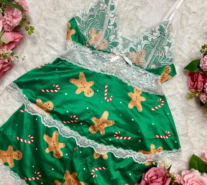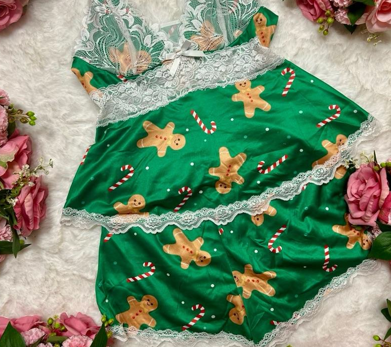 - Green Satin PJs Shorts and Cami Top: These super soft satin pajamas feature a gingerbread man and candy cane print. Perfect for Christmas gift ideas or stocking fillers. 🎁