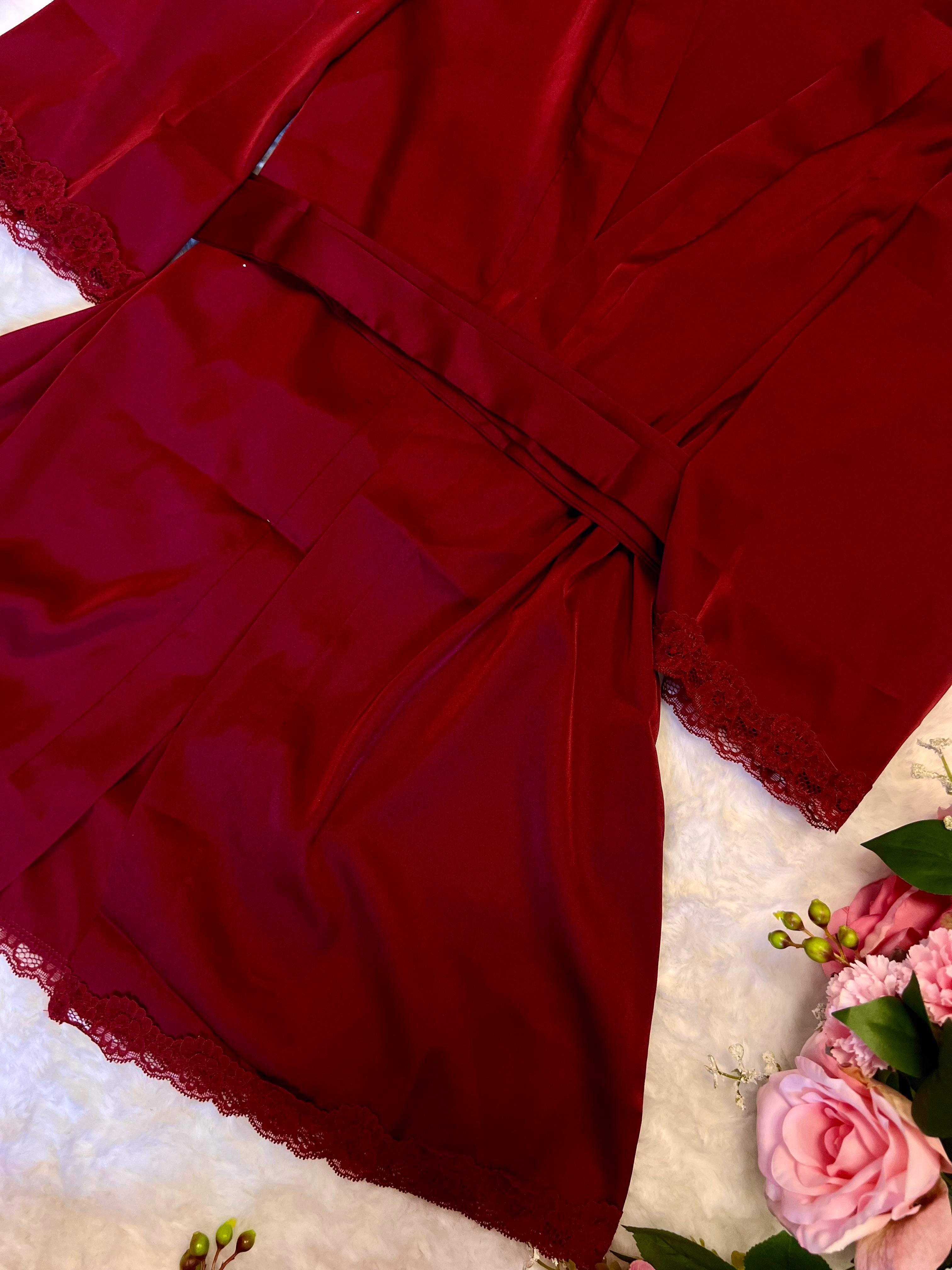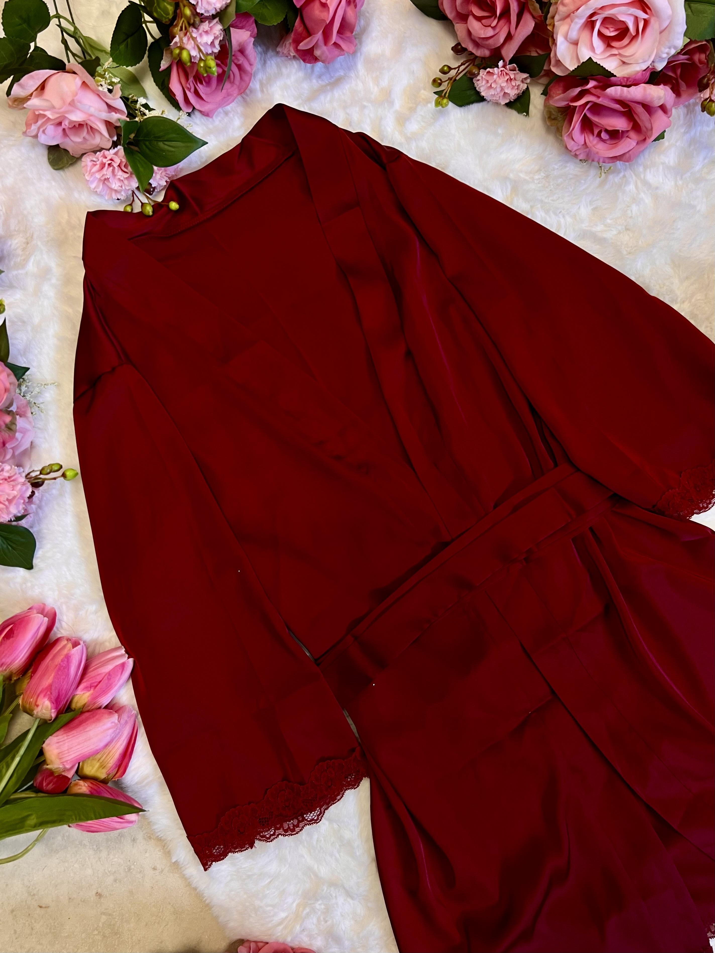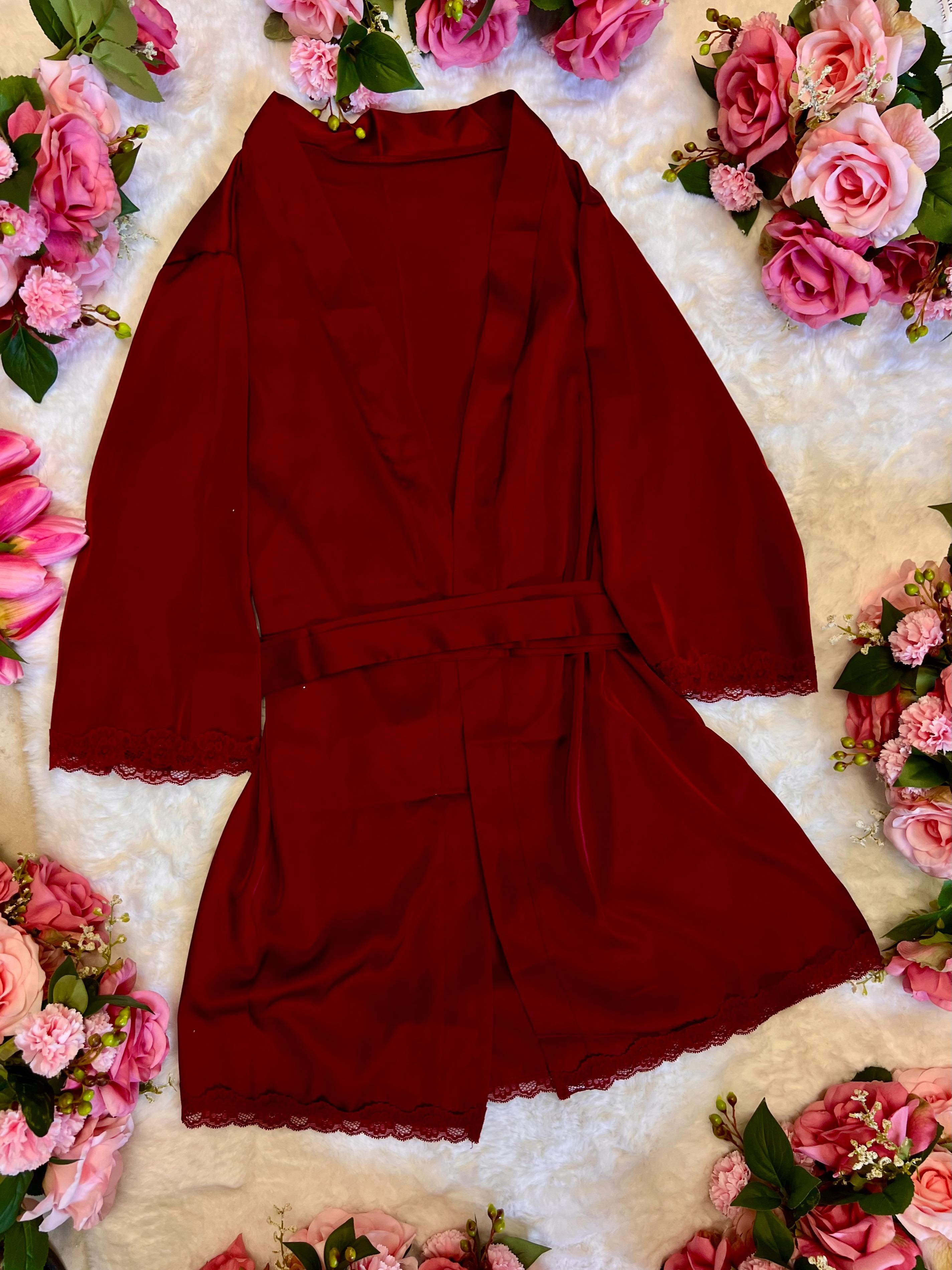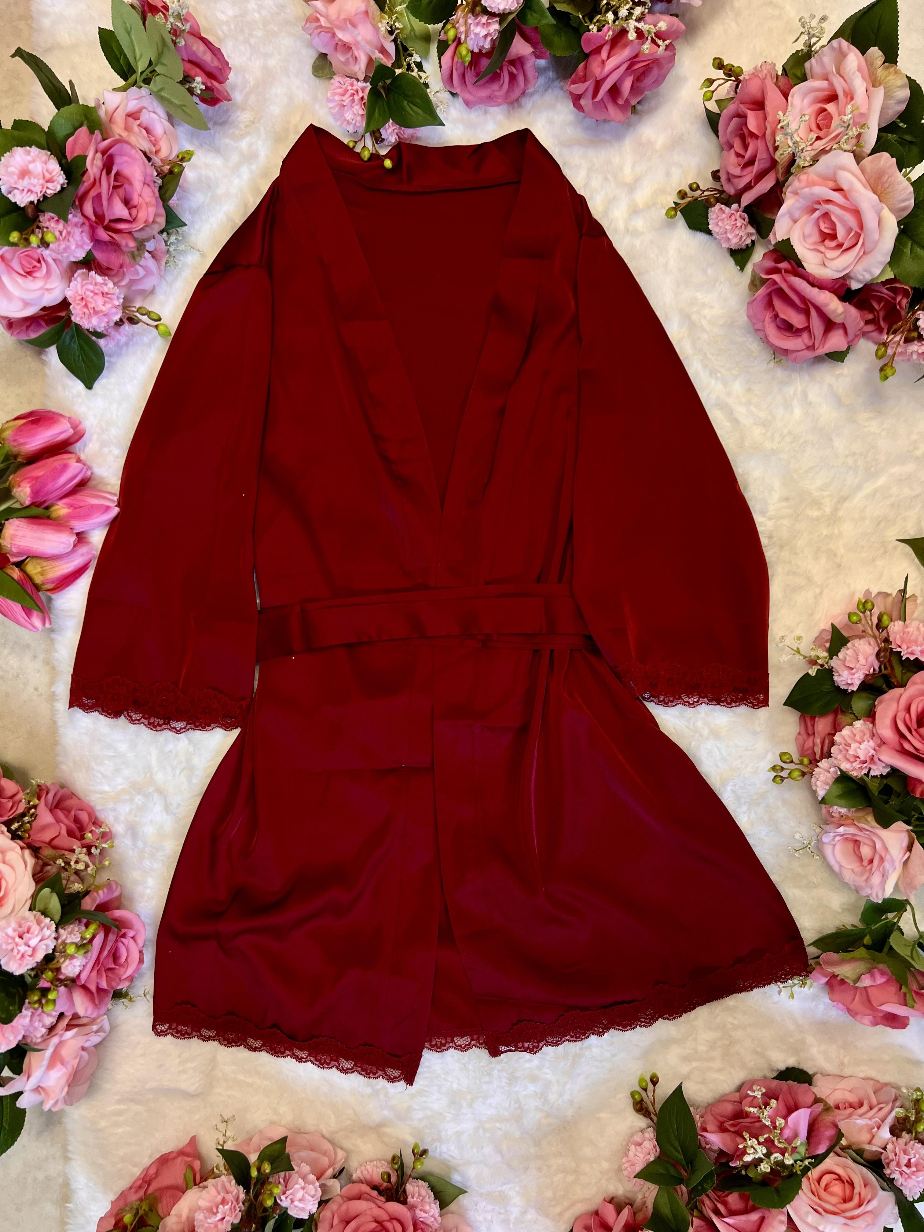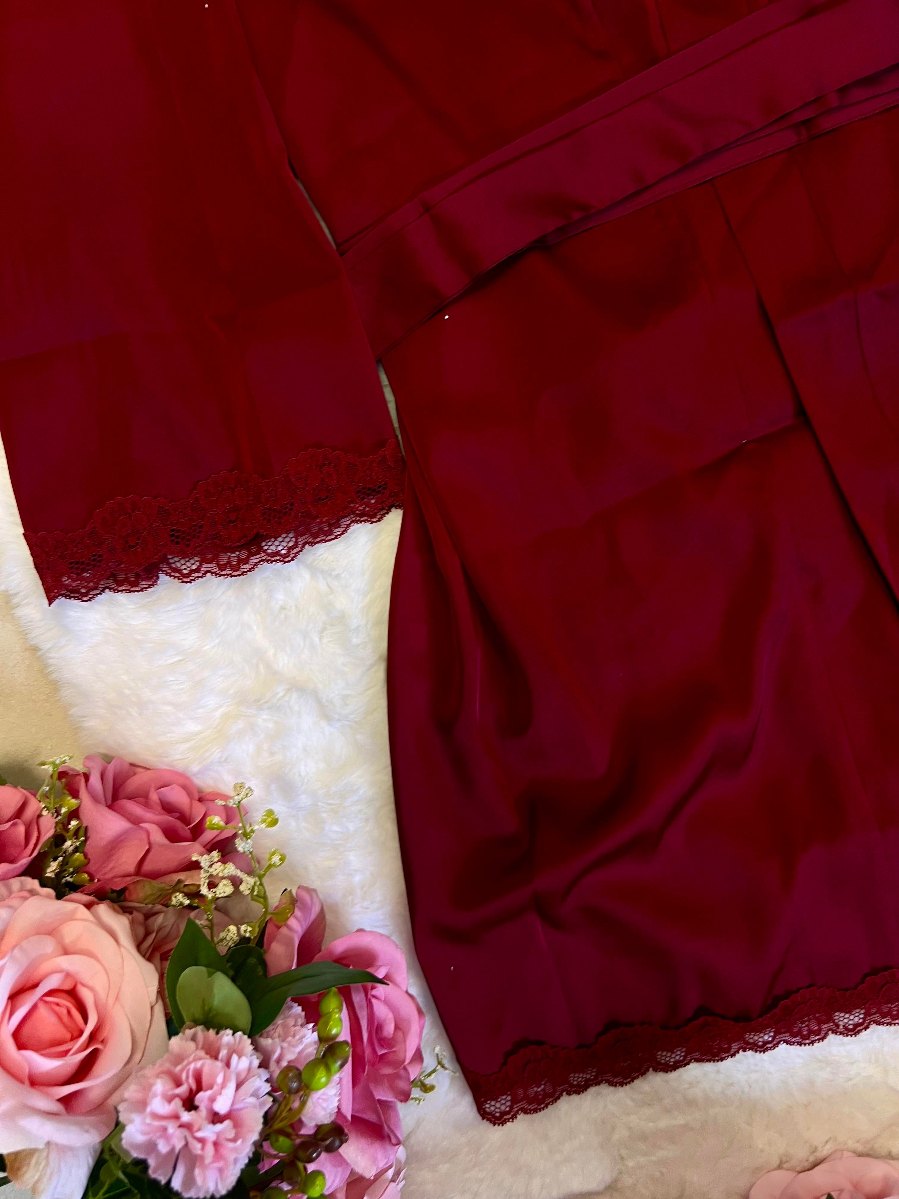 LILIOSA presents the 24 Days of Christmas Robe, a red/burgundy satin robe with a tie and lace hem. Perfect for Christmas Day, this robe is a festive loungewear option. It's super soft and elegant, making it an ideal Christmas gift. Suitable for women, this dressing gown is a classy lounge choice.