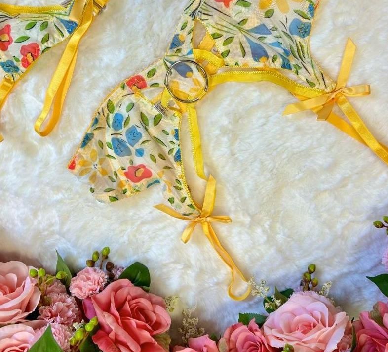 Bright, bold, and beautifully feminine — the Marigold Set is your golden-hour moment in lingerie form. Designed in delicate floral mesh with sunshine-yellow satin trim, this 4-piece set includes a wired bra, matching thong, garter belt, and adjustable thigh straps for the ultimate luxury look.