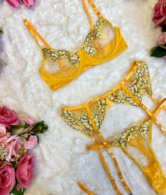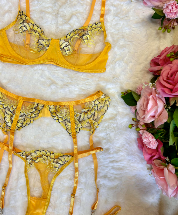 Rise and glow. Phoenix is your sunshine-in-lingerie moment – a bold yellow 4 piece lingerie set with delicate feather-style embroidery that instantly boosts your mood and your confidence.