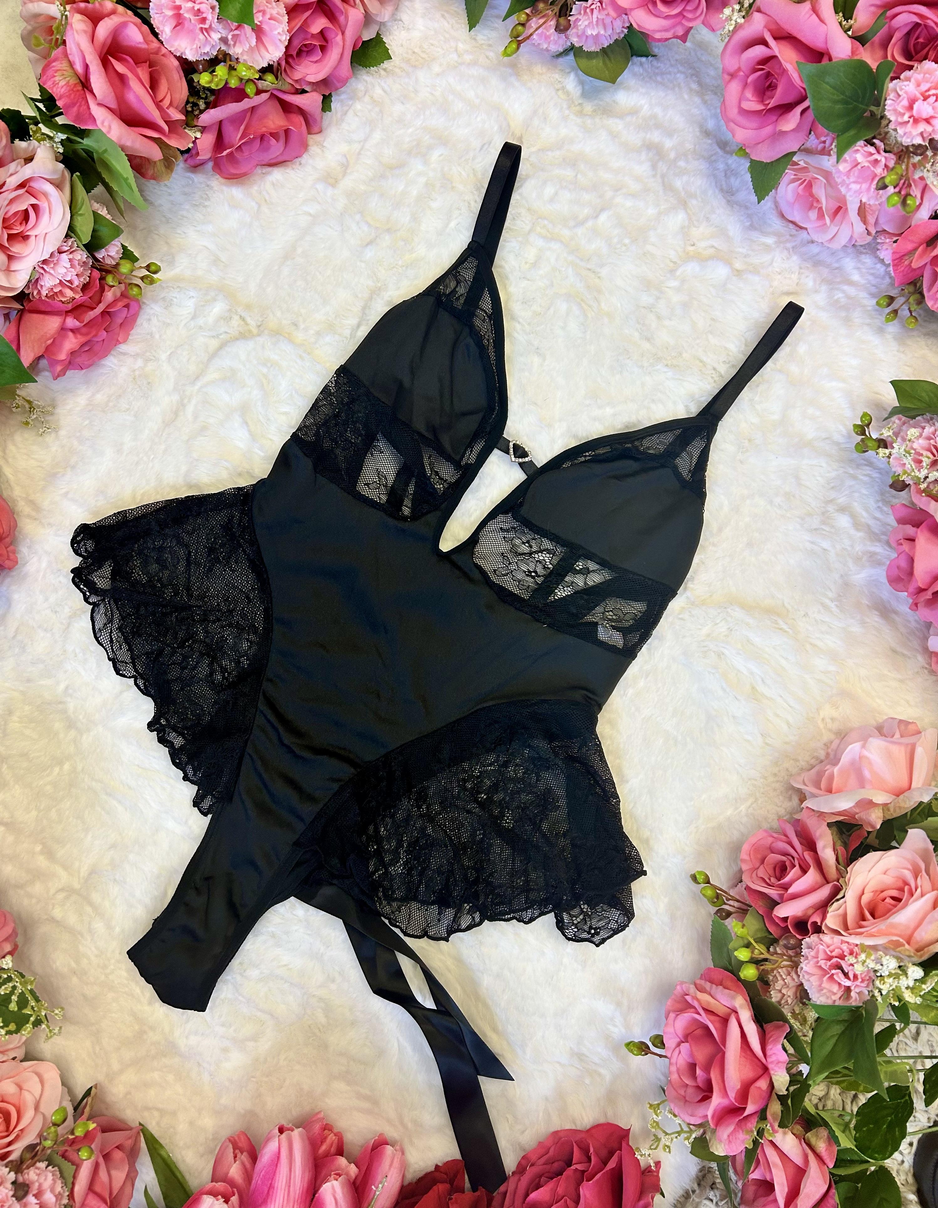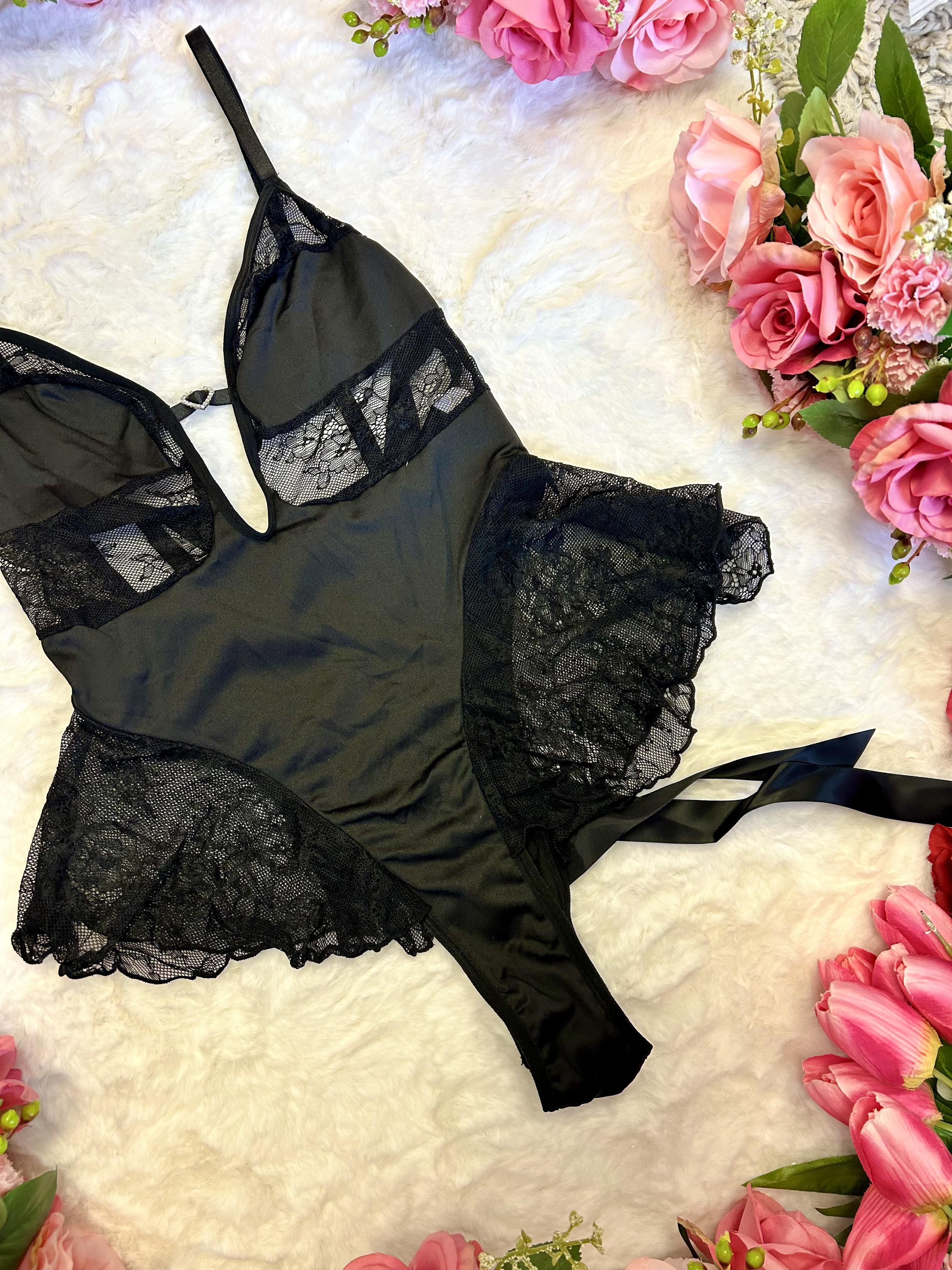 Step into the shadows with the Silhouette Black Satin & Lace Bodysuit. This darkly romantic piece is designed for comfort, confidence, and allure. It features frill side details and double-lined cups, blending vampire vibes with autumn elegance. Perfect for layering, lounging, or Halloween styling.
