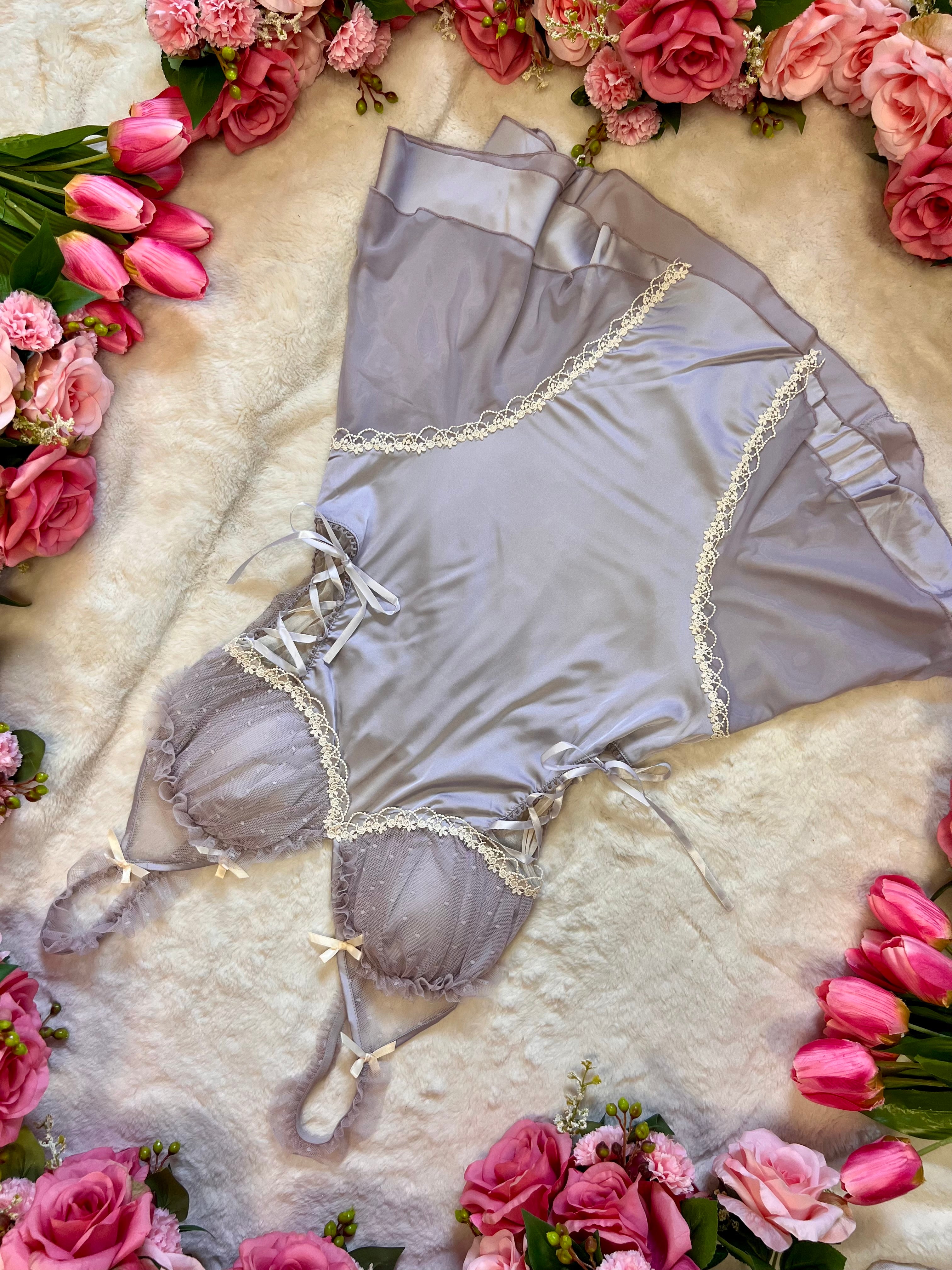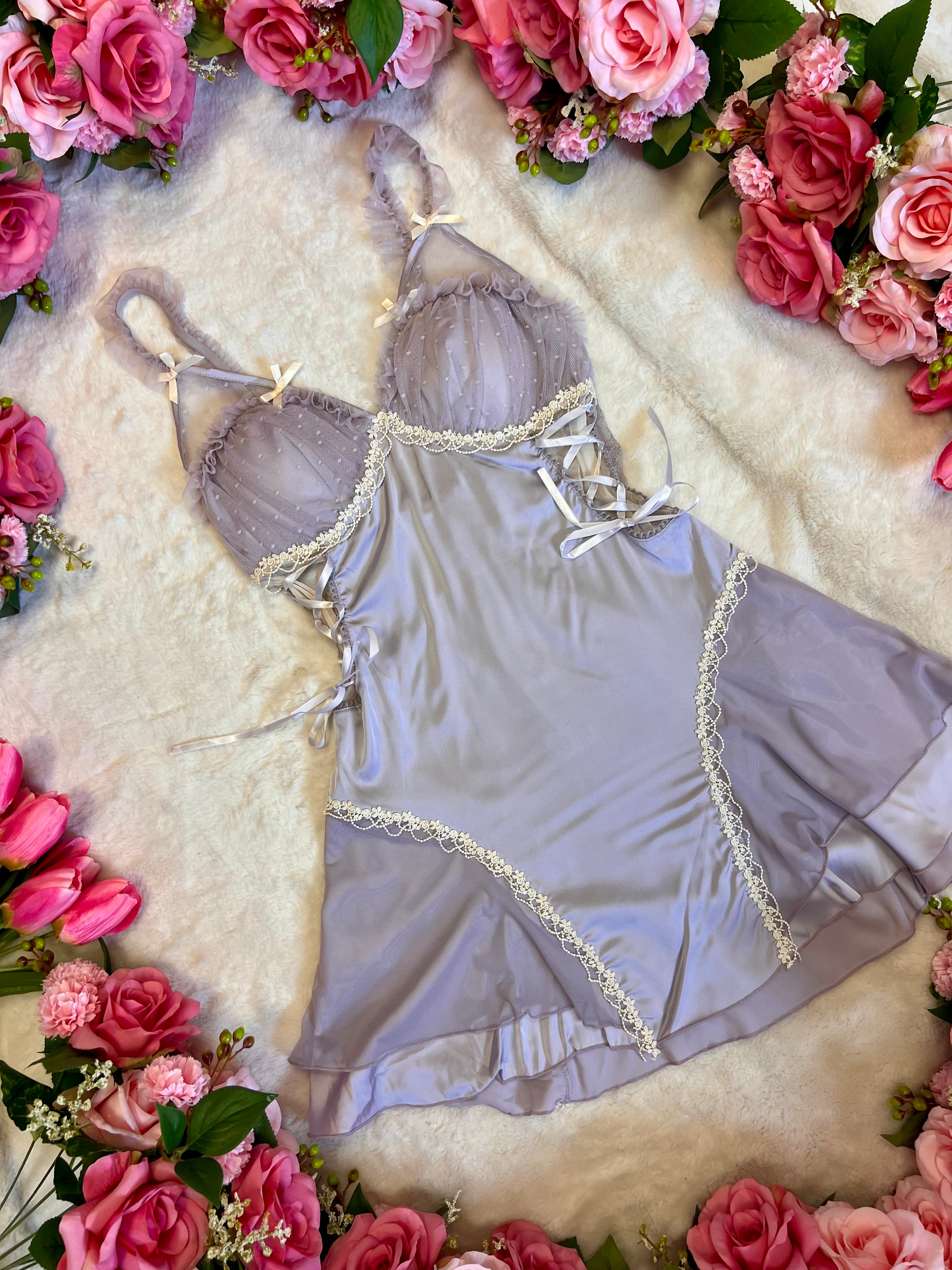 This lingerie dress features a charming lilac satin finish. It includes lace trim and sheer mesh cups for a delicate touch. The corset side detailing adds a sophisticated flair. A satin bow detail enhances the overall look. Perfect for those who appreciate subtle elegance.