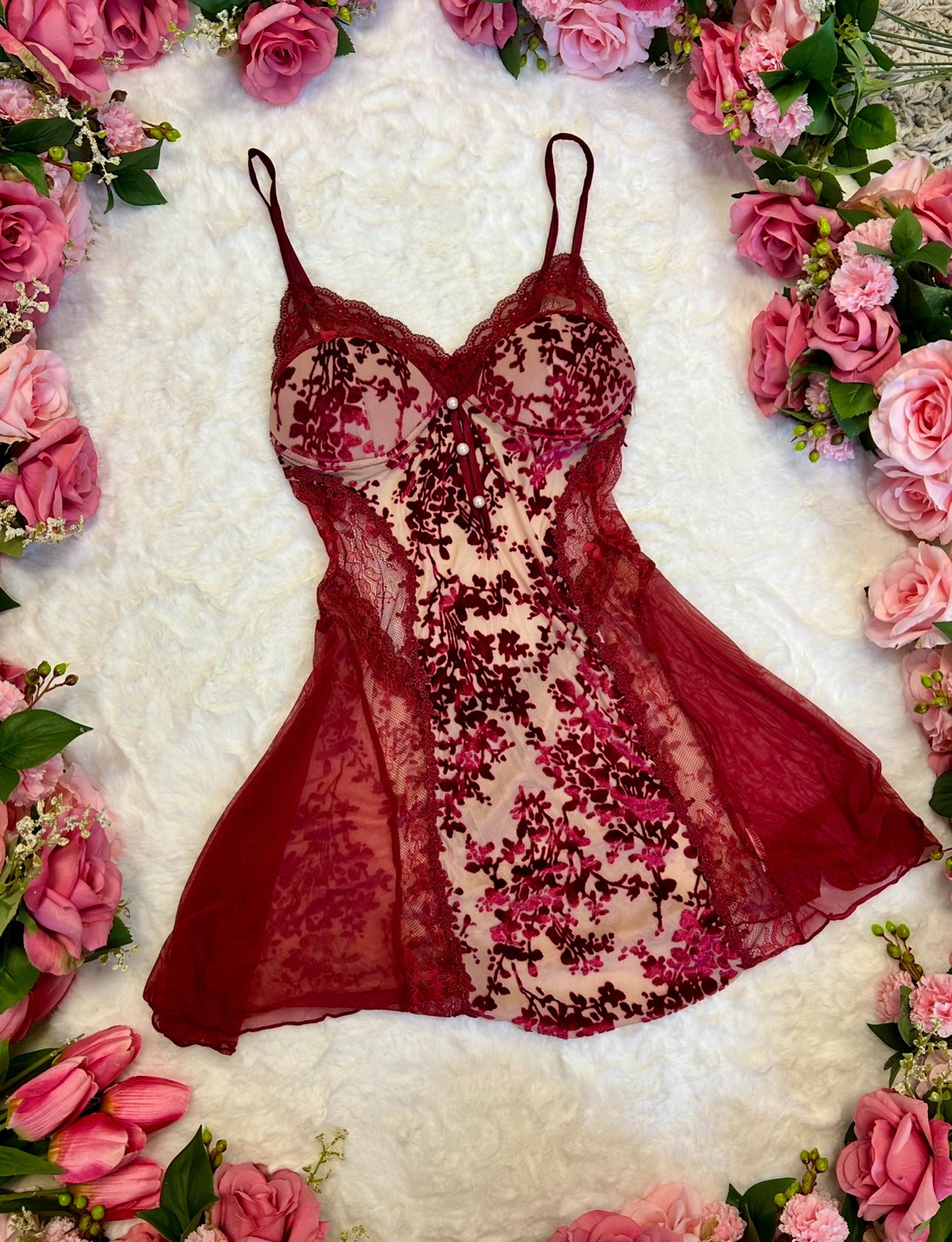 • Material: Combines red velvet and sheer mesh for a unique blend.