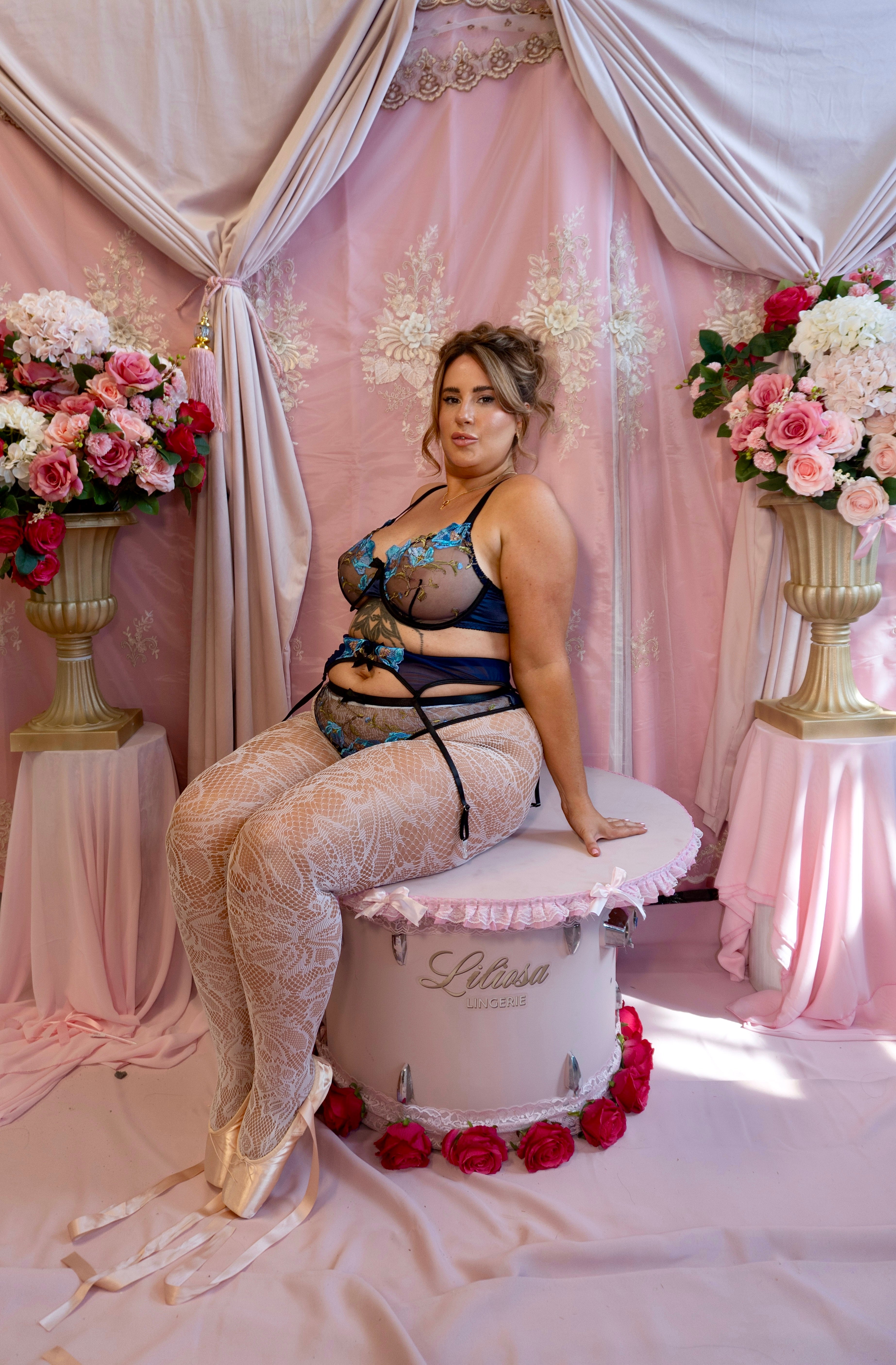 LILIOSA CURVABELLA – ORCHID Navy & Light Blue 4 Piece Plus Size Lingerie Set (Bra, Garter, Pants & Thigh Straps)