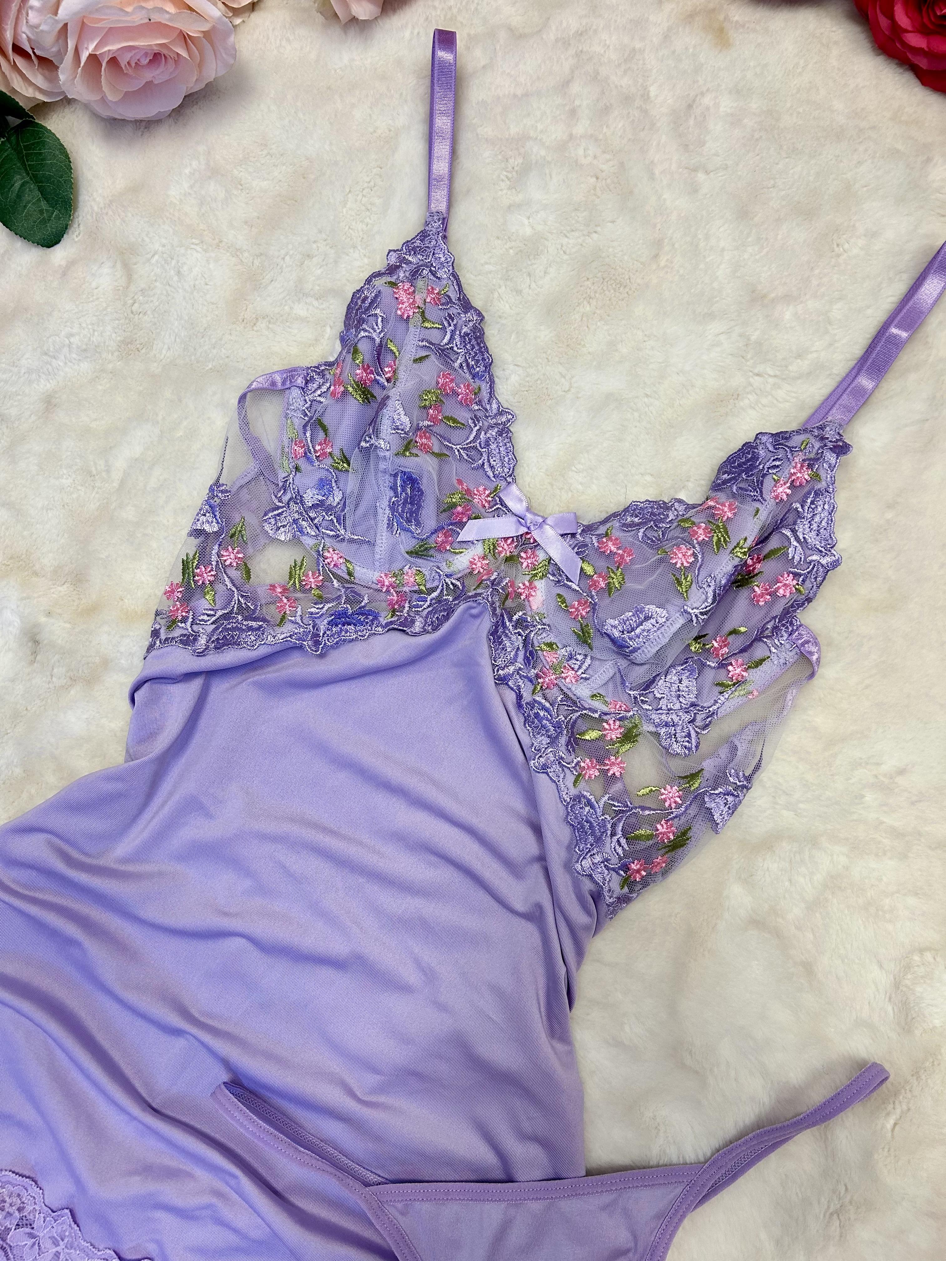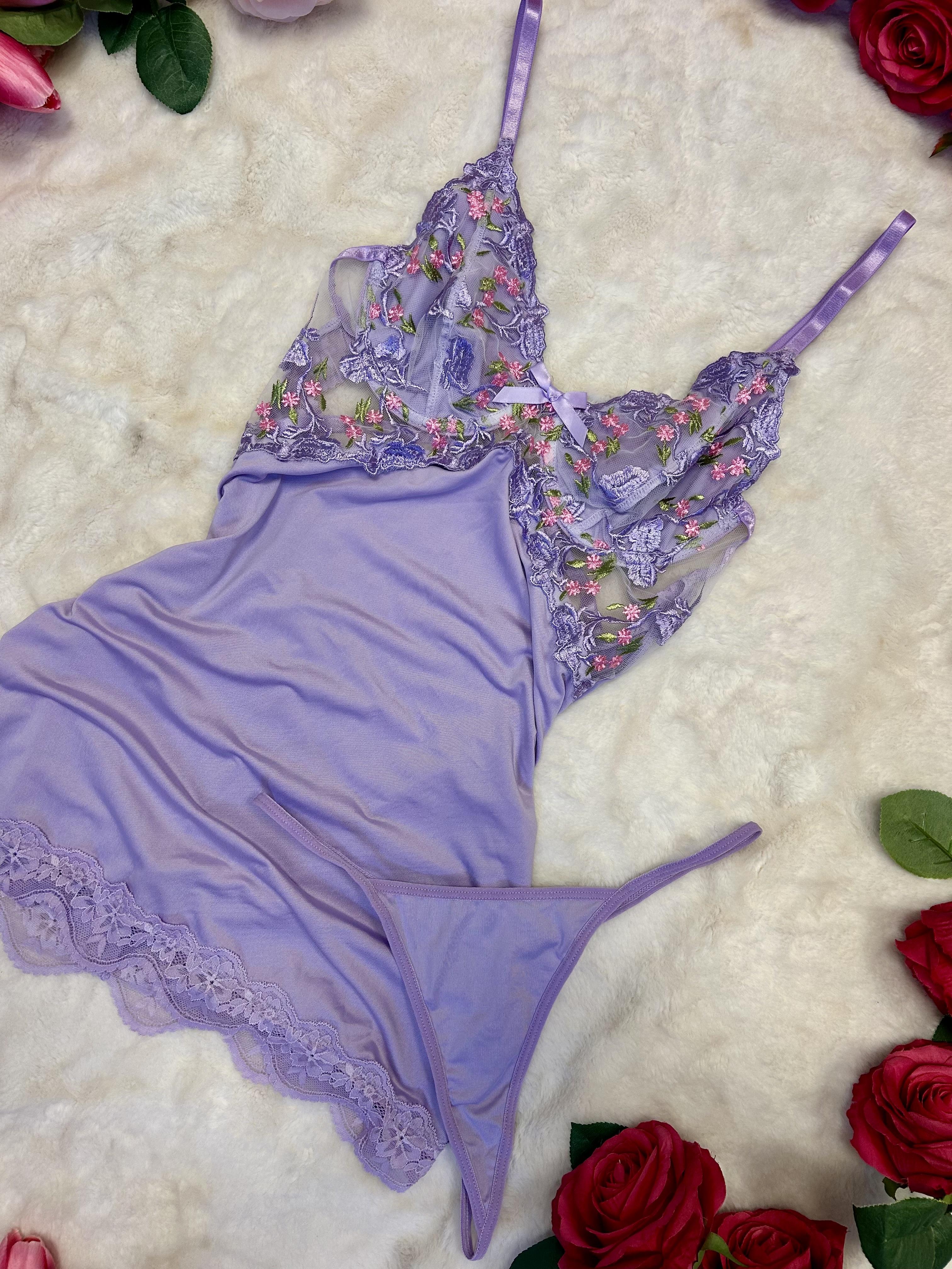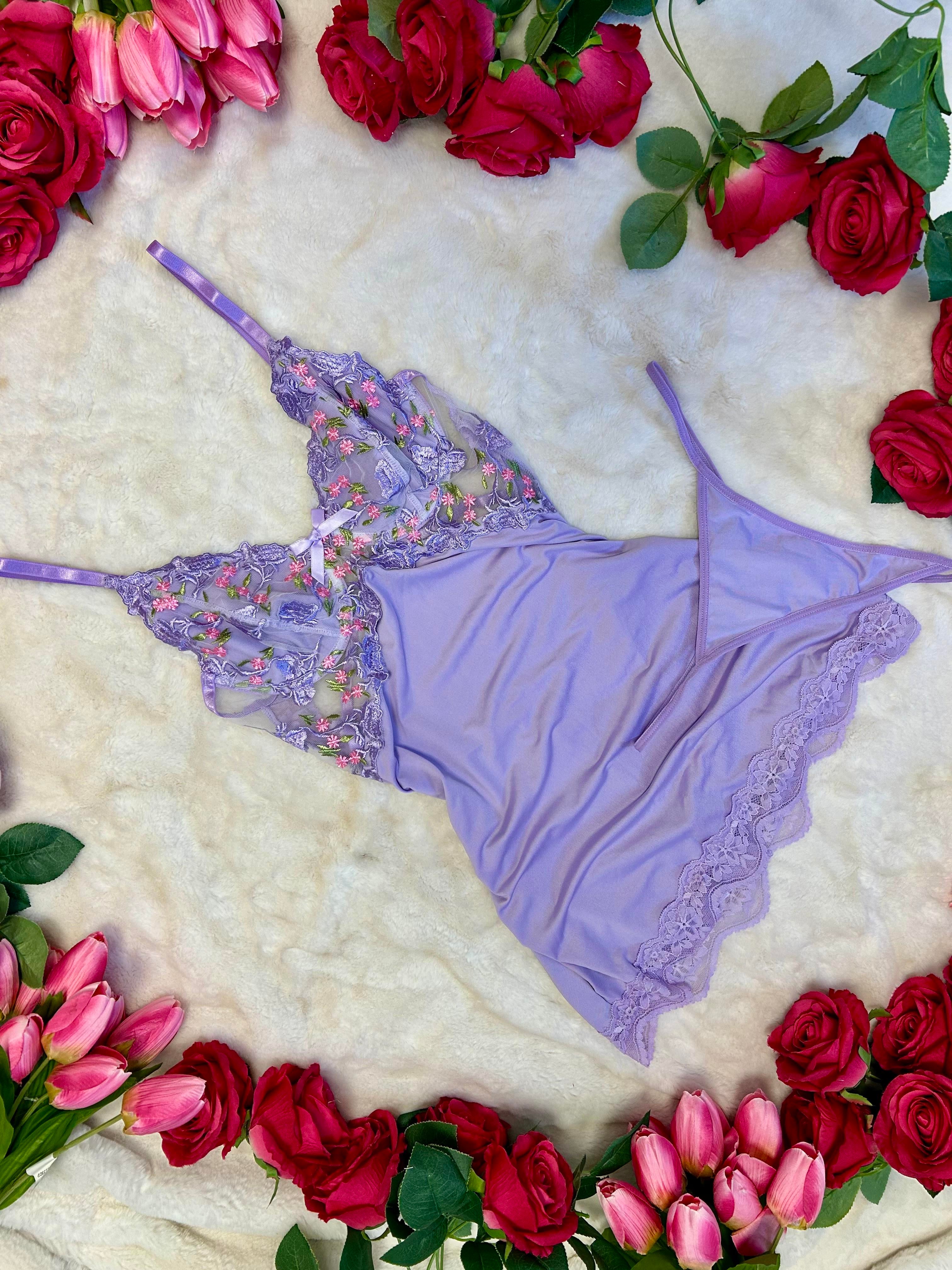 Say hello to your new favorite nighttime look. The Whimsy set is delicate, feminine, and made for dreamy evenings — with embroidered floral lace, silky lilac mesh, and a flattering floaty fit that feels like a soft hug.